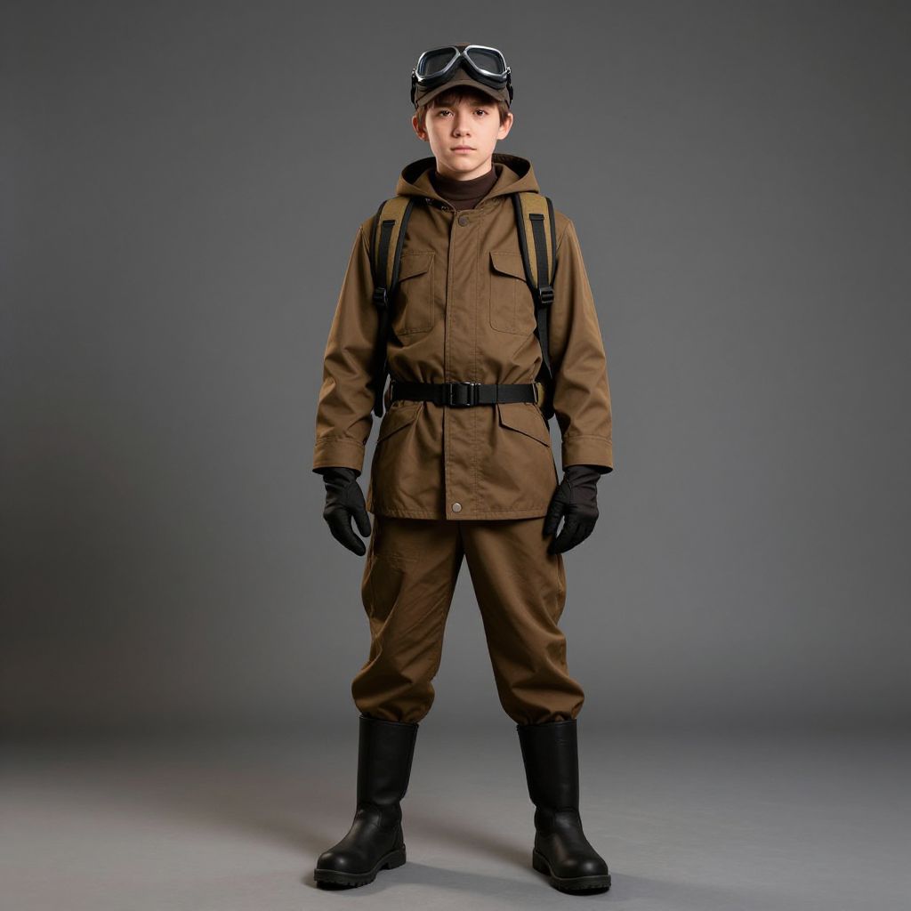 Photograph of a young boy standing against a gray gradient background. He wears a brown aviator-style military outfit with a high collar, black belt, black gloves, and black boots. His brown cap is adorned with goggles on top. A black harness is strapped over his shoulders. The boy has light skin, short brown hair, and a neutral expression. The lighting is even, highlighting the textures of the fabric and the details of his uniform, giving a slightly vintage aviation pilot look. The overall composition is centered and symmetrical.