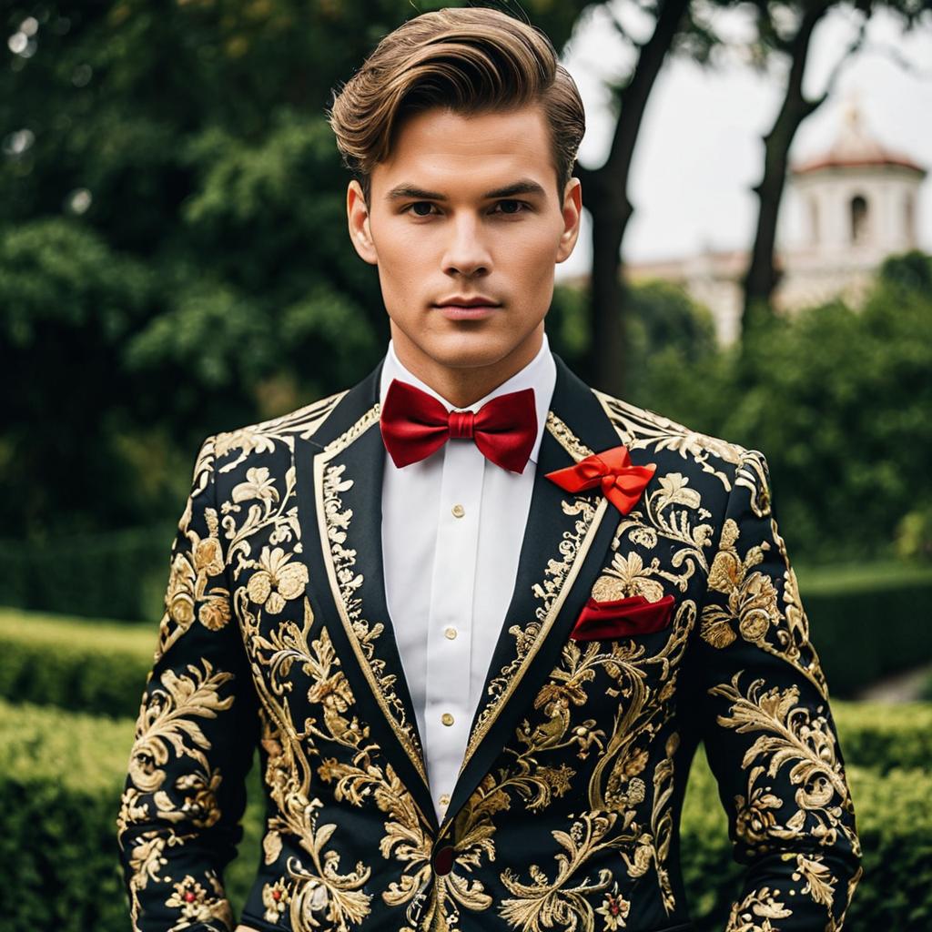 Man fancy dress outfit fancy, photorealistic, male model, vintage Victorian style, standing in garden, daytime, warm sunlight, brown leather vest with white fur collar, gold trim, brown and gold striped waistcoat, white lace cuffs, brown pants, short brown wavy hair, serious expression, background: orange flowers, green bushes, blurred house and trees, high detail, soft shadows, elegant, historical fashion, sophisticated, realistic ures, natural lighting, outdoor setting