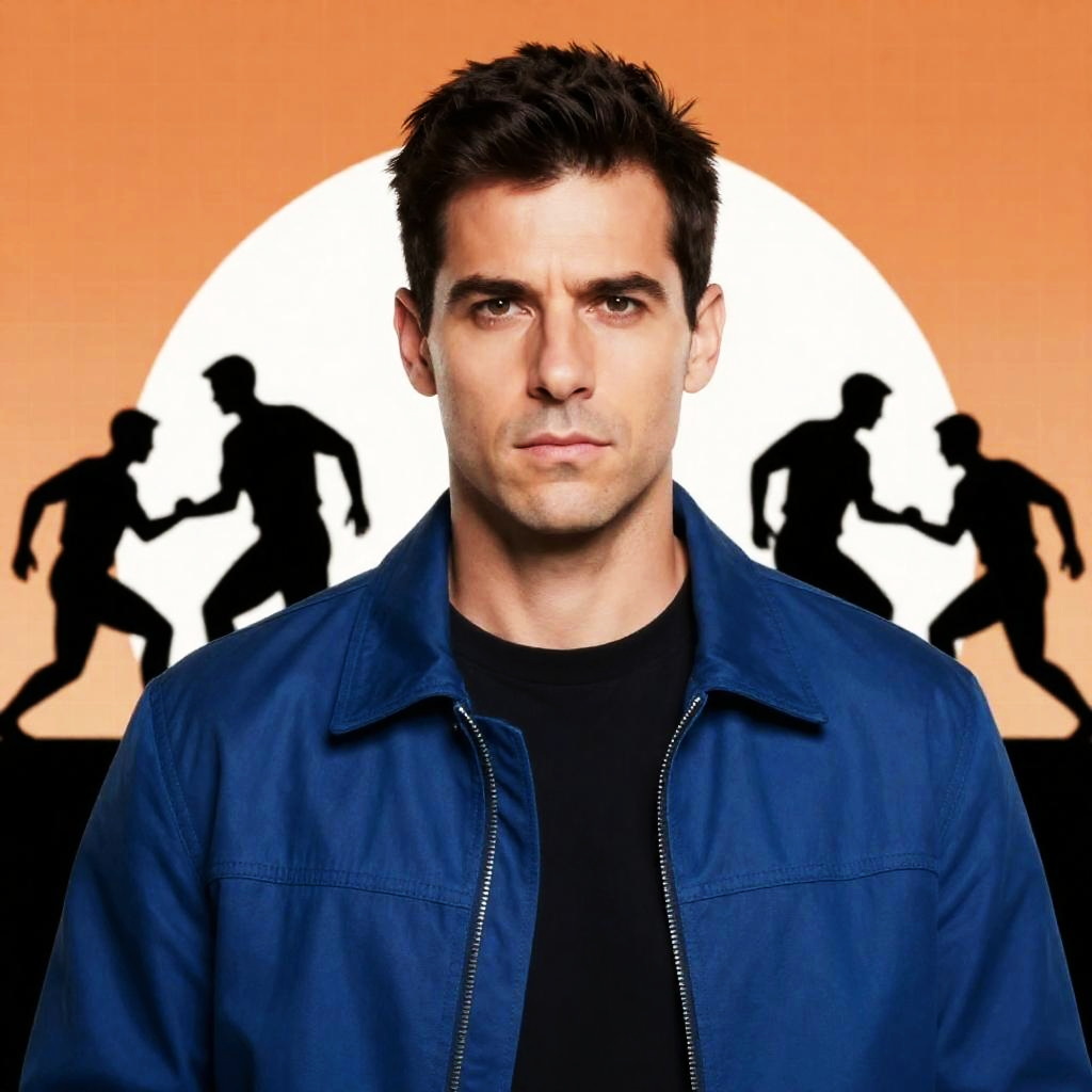 Photograph of two men in a dimly lit bar. The man on the left has short dark hair, wears a black leather jacket with arms crossed, slightly tilted head, intense gaze. The man on the right has a mustache, short hair, wears a red shirt and black jacket, serious expression. Background includes blurred figures, purple lighting.