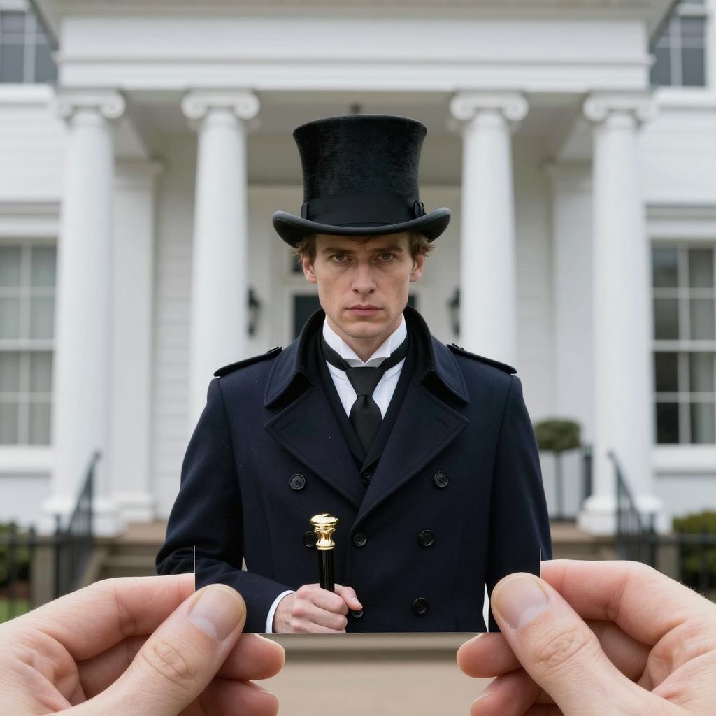 Photograph of a man in a tall black top hat and dark coat, holding a cane, standing in front of a white house with columns. Hands holding the photo from the bottom. Man has intense gaze, slightly turned head.
