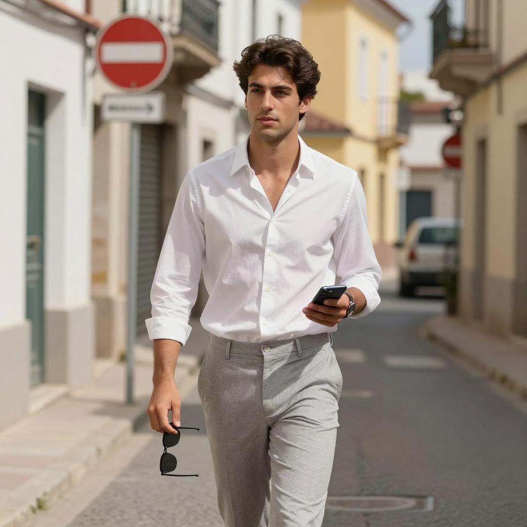 A cheerful young man wearing a casual blue t-shirt smiles optimistically as he stands on an old city street, capturing a feeling of contentment and positive outlook in an artistic fresco-secco-inspired photographic style.