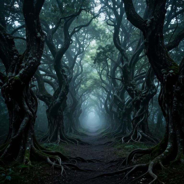 The image depicts a dark, eerie forest scene bathed in a mysterious, ethereal glow. The forest is dense with twisted, gnarled trees whose branches伸展 outwards, creating an intricate network of shadows and light. The trees are adorned with intricate, twisted roots that cascade down towards the ground, adding to the sense of foreboding. The ground is covered in a layer of dark, damp earth, with patches of moss and lichen growing on the tree trunks and branches. The overall color palette is dominated by deep blues and greens, with occasional highlights of white and silver, creating a sense of depth and atmosphere. The forest appears to be shrouded in mist, adding to the sense of mystery and unease. The composition is centered around a path that winds through the forest, leading the viewer's eye deeper into the scene, where the light seems to grow dimmer and more mysterious. The overall effect is one of a dark, otherworldly landscape, filled with a sense of the unknown and the uncanny.