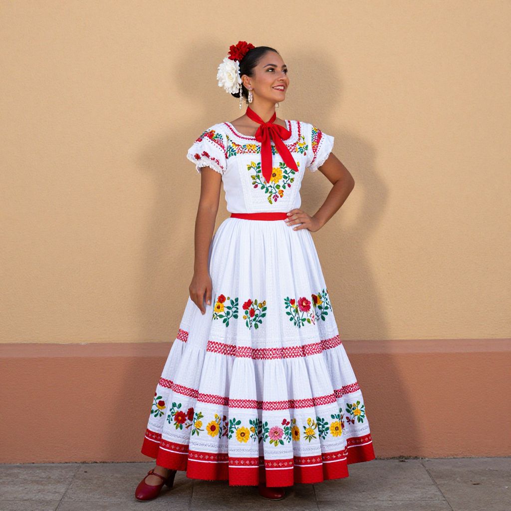Photograph of a smiling Latina woman standing against a beige wall. She wears a traditional Mexican dress with a white bodice and skirt, adorned with colorful floral embroidery and red accents. The dress has short sleeves with red trim, a red ribbon bow at the neck, and a wide red sash. Her dark hair is styled in a bun with a red and white flower accessory. She wears red shoes and stands with one hand on her hip. The ground is a gray concrete surface, and the wall has a pinkish base. The lighting casts a subtle shadow behind her.