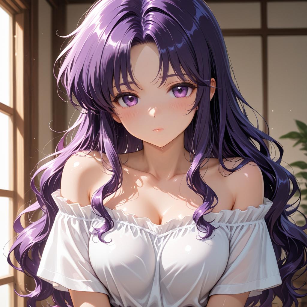 1girl, solo, long hair, breasts, looking at viewer, smile, bangs, shirt, dress, bare shoulders, closed mouth, purple eyes, collarbone, white shirt, upper body, purple hair, short sleeves, sidelocks, shiny, off shoulder, parted bangs, wavy hair, off-shoulder shirt, retro artstyle, 1990s (style), 1980s (style)