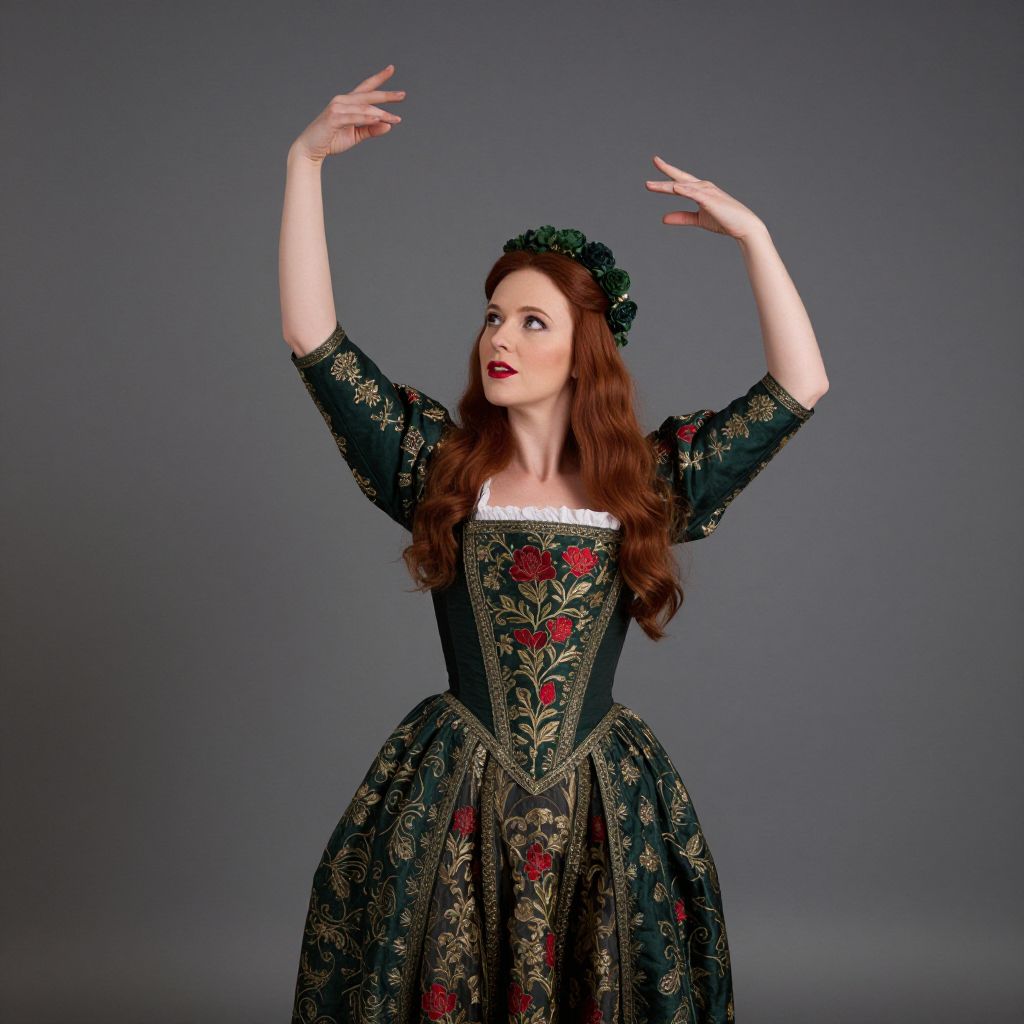 Photograph of a fair-skinned woman with long, wavy red hair wearing a dark green, Renaissance-style dress adorned with gold embroidery and red floral patterns. She has red lipstick and a green floral headpiece, with her arms raised in a graceful, elegant pose. The background is a plain, textured gray, making her and her intricate dress stand out.