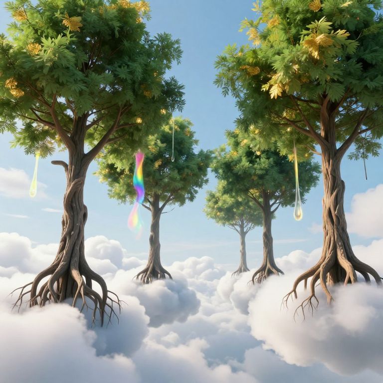 A surreal 3D-rendered scene depicts an ethereal grove of inverted trees suspended in the sky, their roots firmly planted in fluffy white clouds while vibrant green foliage and golden highlights reach toward the heavens, creating a mesmerizing visual effect as if they are drip-feeding the atmosphere with liquid rainbow vapor.