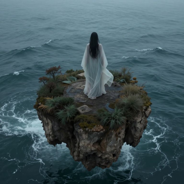 A mesmerizing image captures an enigmatic figure draped in ethereal garments standing atop a floating island amidst choppy waters. This celestial perspective reveals the scene from a transcendent viewpoint, invoking both tranquility and unease within the viewer. The artistic approach is characterized by intricate details and emotive depth, evoking a sense of mystery that permeates throughout this captivating tableau.