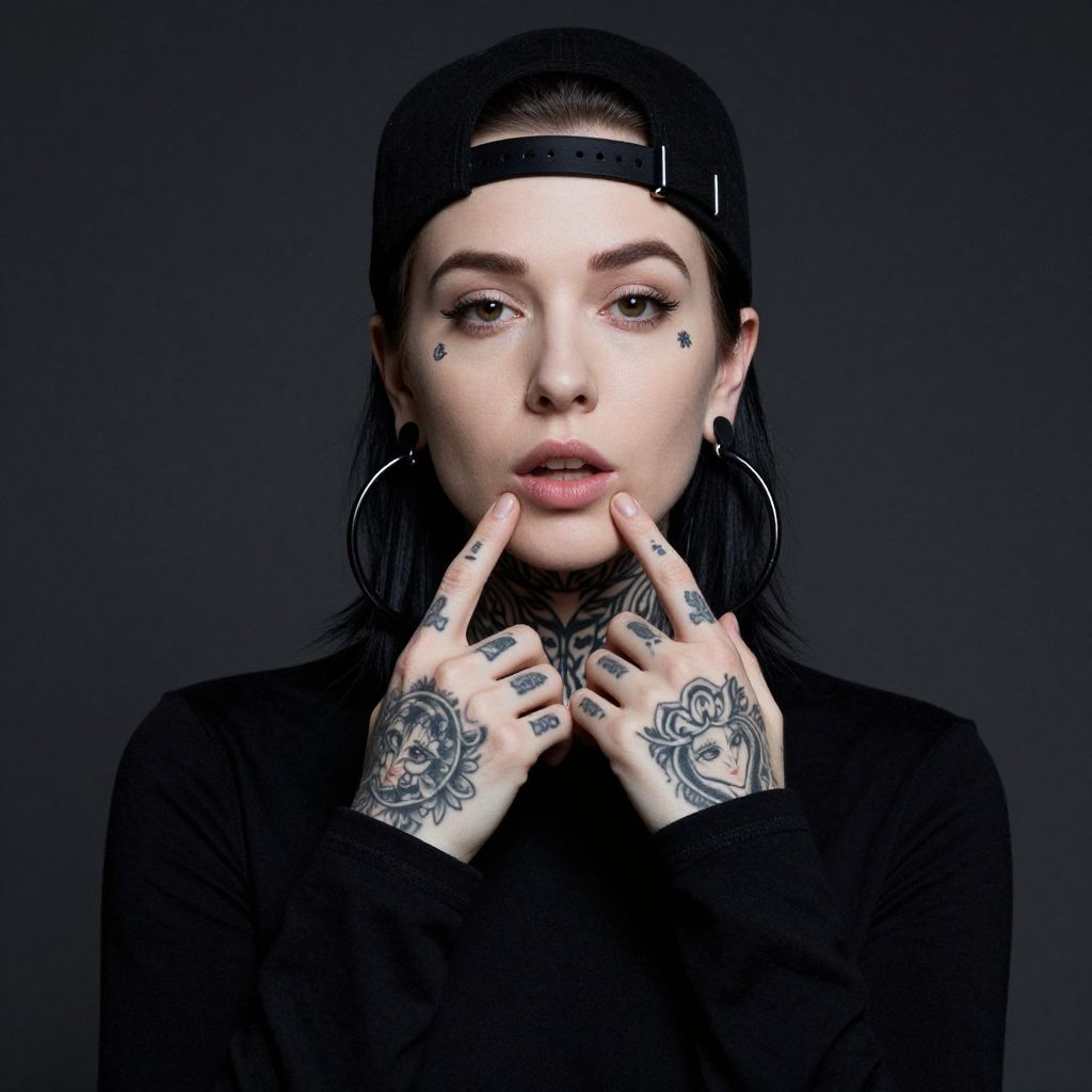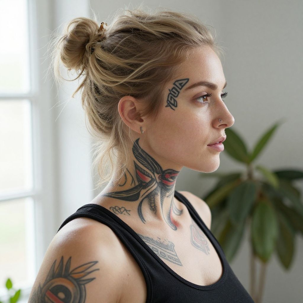 Photograph of a young woman with light brown hair and fair skin, looking slightly to the side with a neutral expression. She has multiple tattoos on her face and neck, including black ink letters and symbols, a green and red floral design, and a black choker-style tattoo around her neck. She has a nose ring and a lip piercing. The background features floral curtains with red and pink flowers.