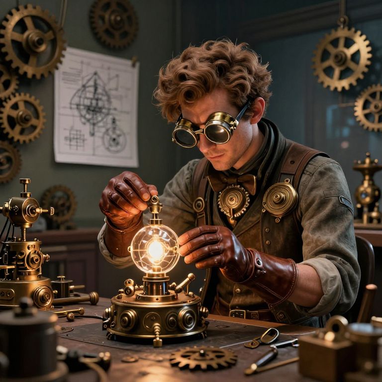 Daiky depicted as a steampunk inventor in a cluttered workshop, filled with gears, brass machinery, and steam pipes, warm ambient lighting, a focused expression as they craft a glowing mechanical device, highly detailed environment.