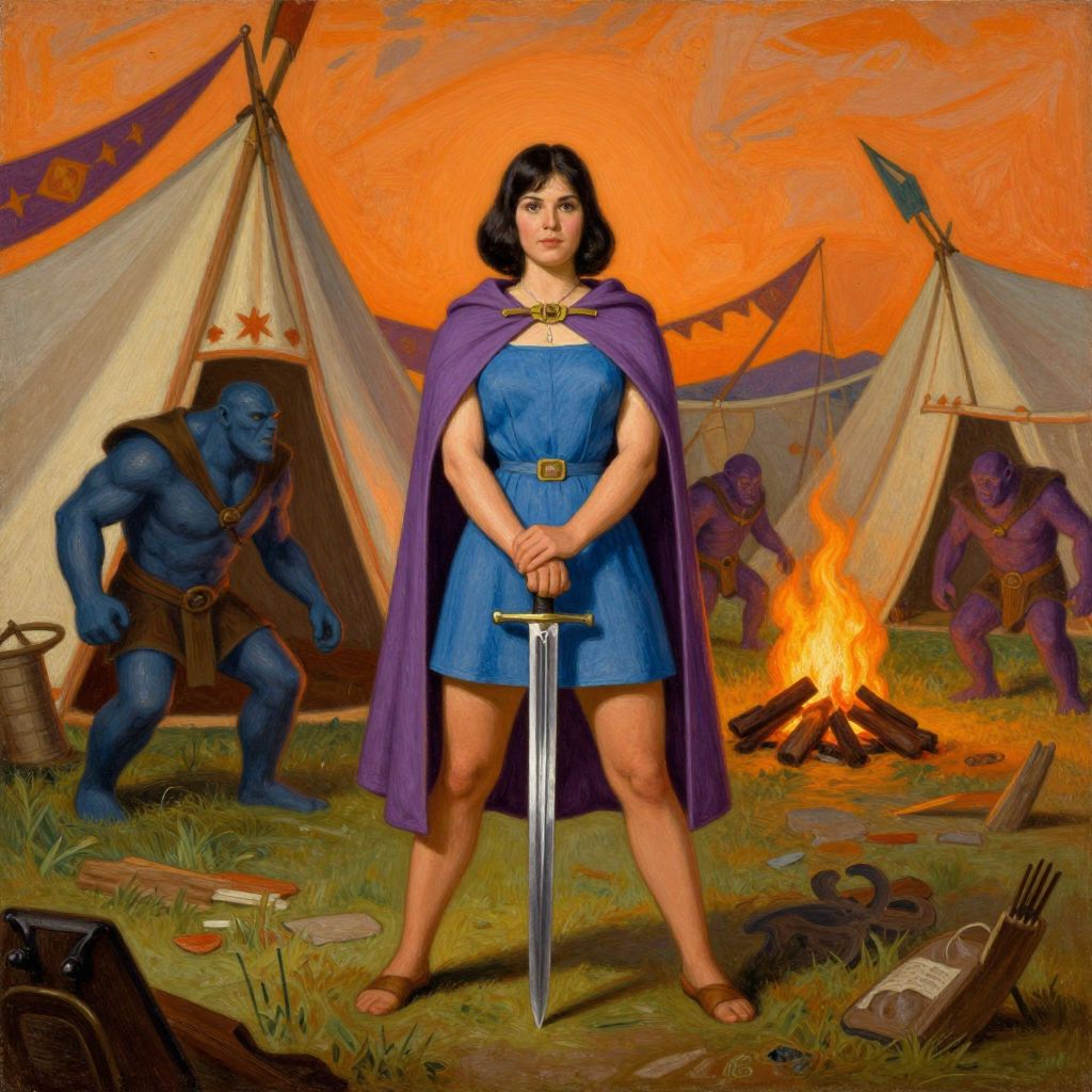 In this 1960s fantasy painting, a woman with dark hair stands confidently in a medieval war camp, her full figure and legs visible as she holds a sword. She is dressed in a blue dress with a belt, and her attire is complemented by a purple cloak draped over her shoulders. The painting is rich with details, featuring tents and banners in the background, with a warm, orange glow emanating from a fire. Orc creatures, depicted in a mix of blues and purples, are visible in the background, adding to the medieval atmosphere. The overall composition is dynamic, with the woman positioned centrally, her body aligned with the tents and banners, creating a sense of balance and harmony. The interplay of colors, textures, and shapes enhances the visual richness of the scene, capturing the essence of a medieval fantasy world.
