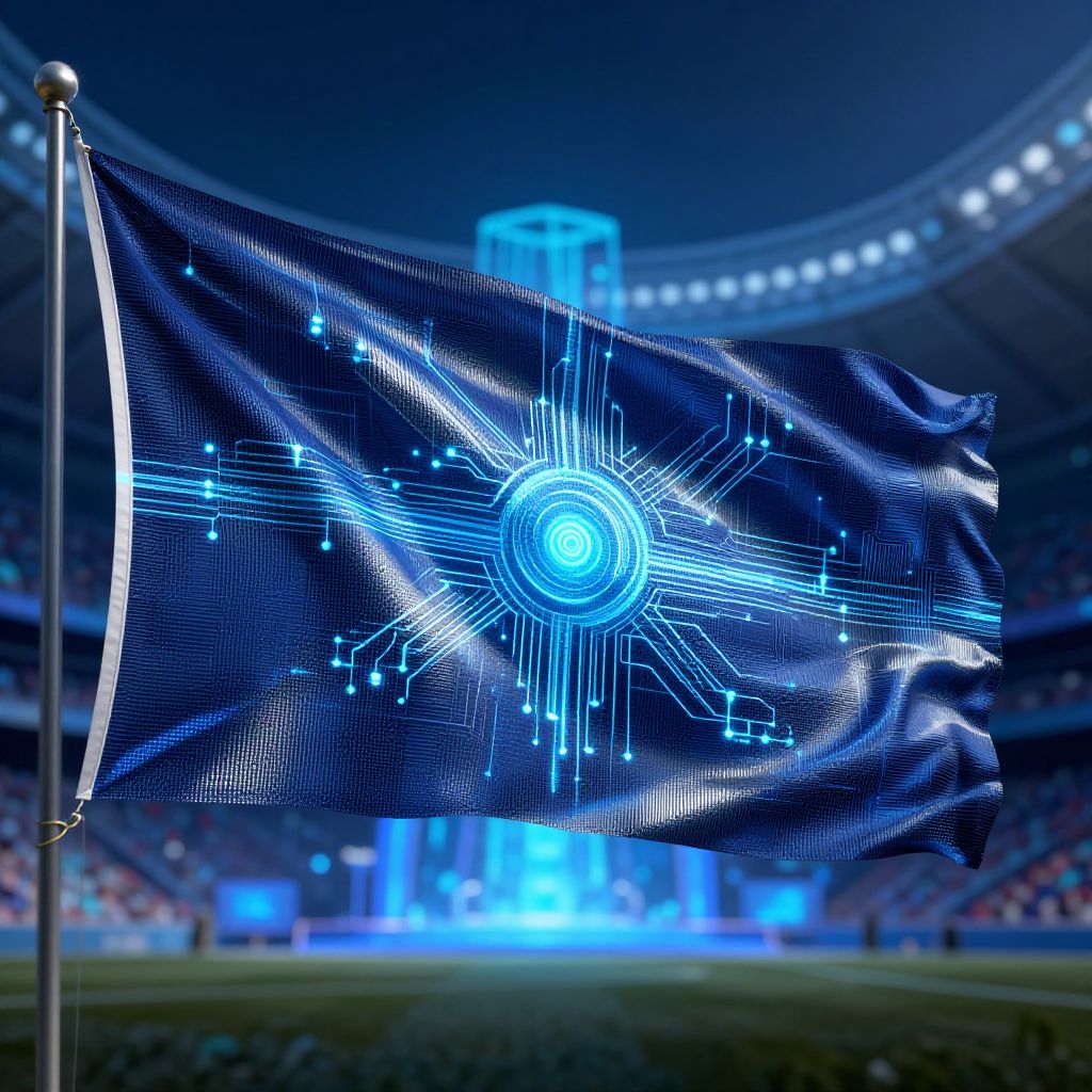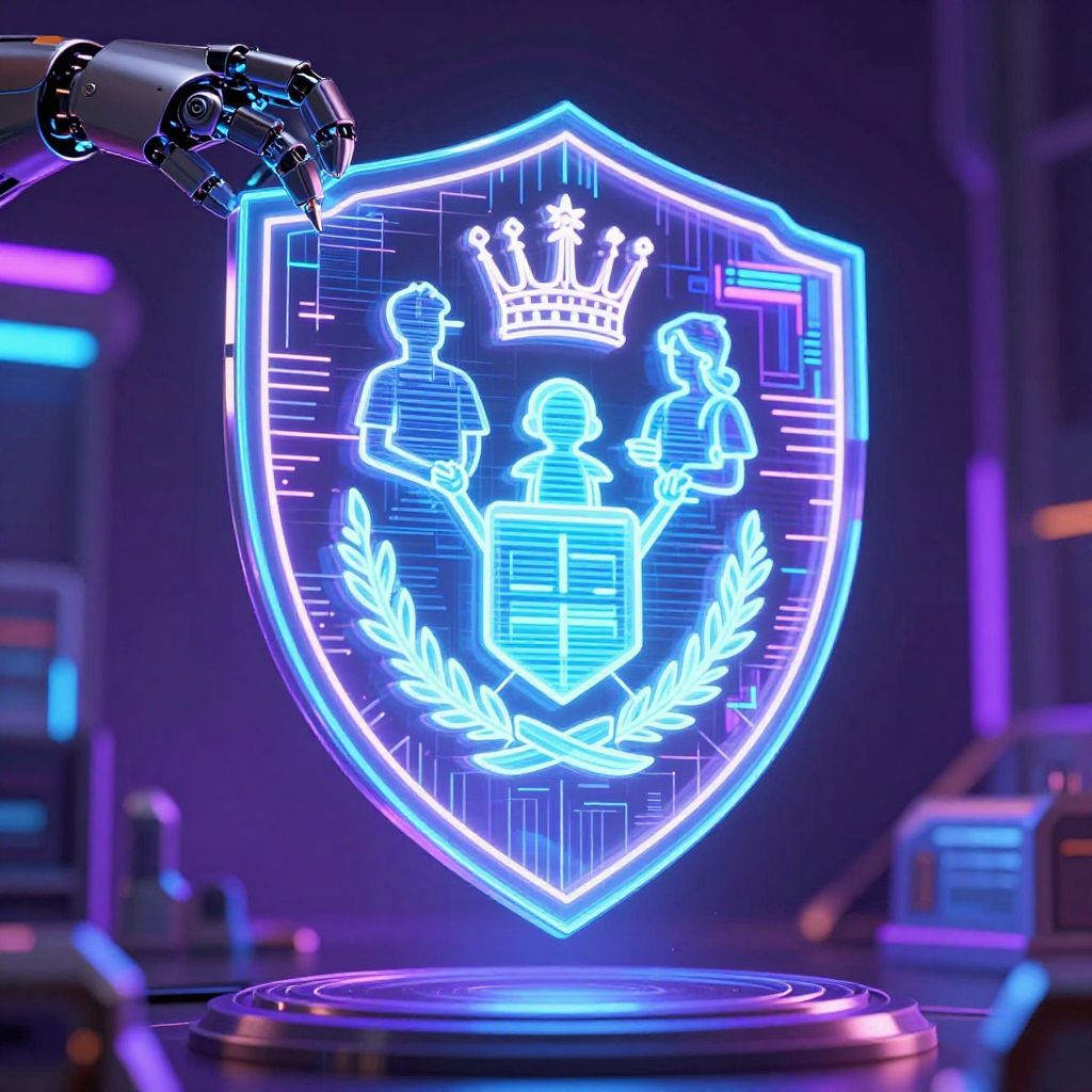 A futuristic crest maker robot crafting a glowing digital family crest, neon lines and cyberpunk aesthetics, holographic shield floating in the air, sleek metallic textures, vibrant purple and blue lighting, sci-fi environment, ultra detailed scene.