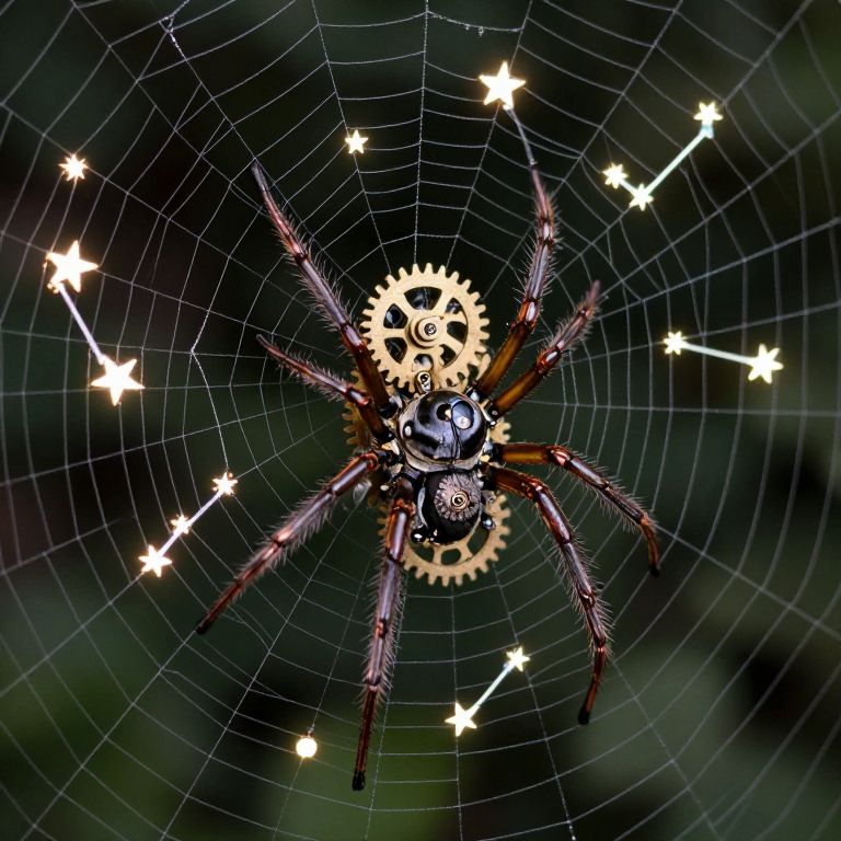 A clockwork spider weaves constellations into its web, each star blinking out like whispers of time, as the rhythmic hum of its gears echoes the eternal dance between creation and decay.