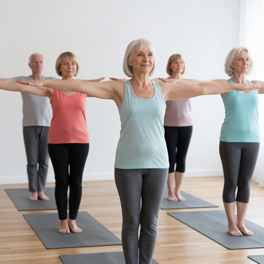 4 older people doing a standing yoga pose with arms outstretched. The woman at the front has white hair and is smiling.