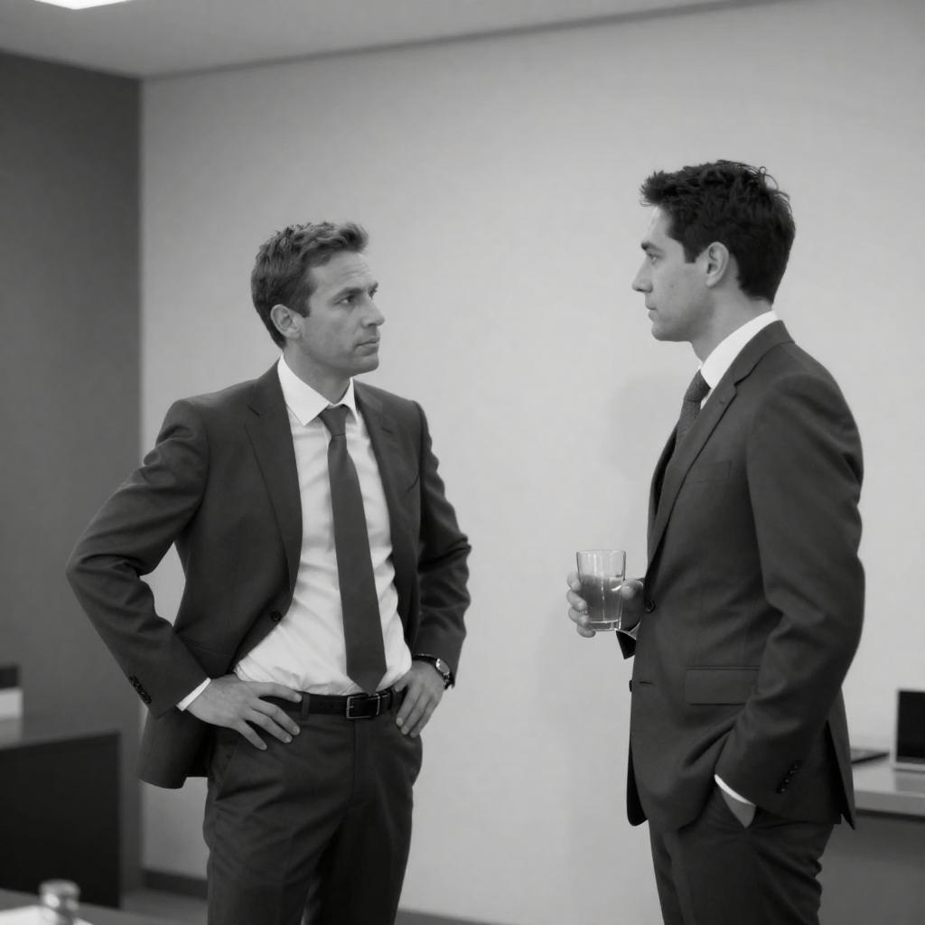 Black-and-white photograph of two men in suits standing in a modern room. The man on the left, with hands on hips, has a serious expression and short hair. The man on the right, with dark hair, looks at him while holding a glass. A shadow of the man on the left is cast on a ured wall behind them.