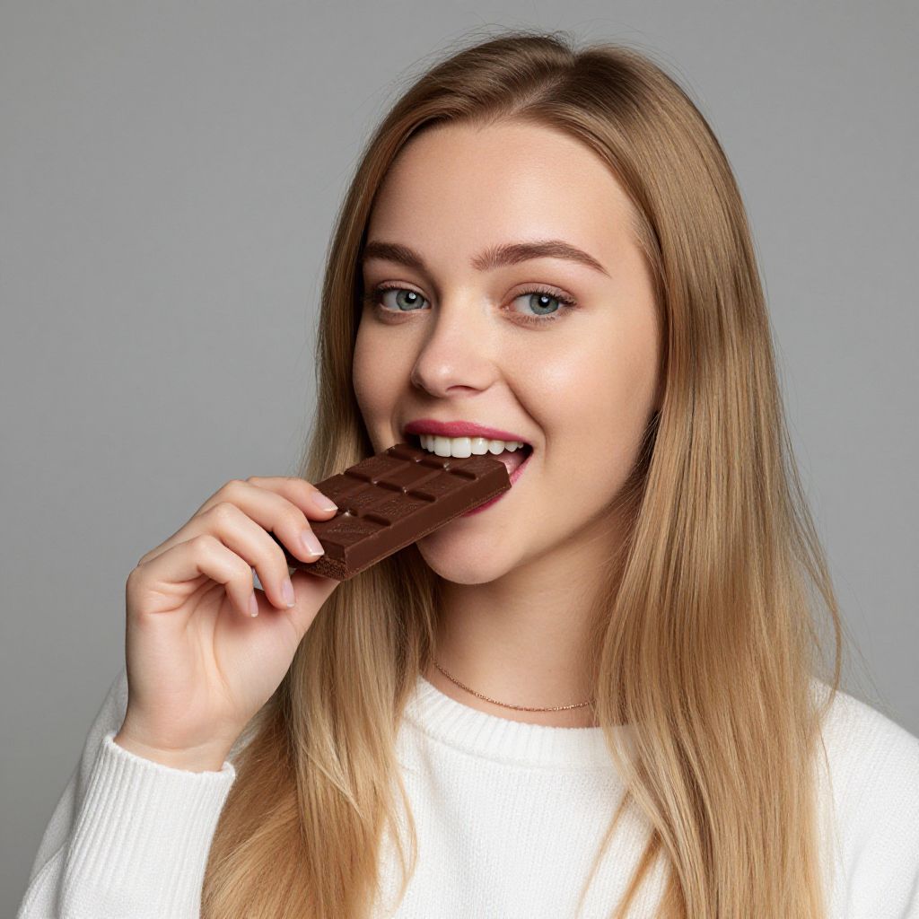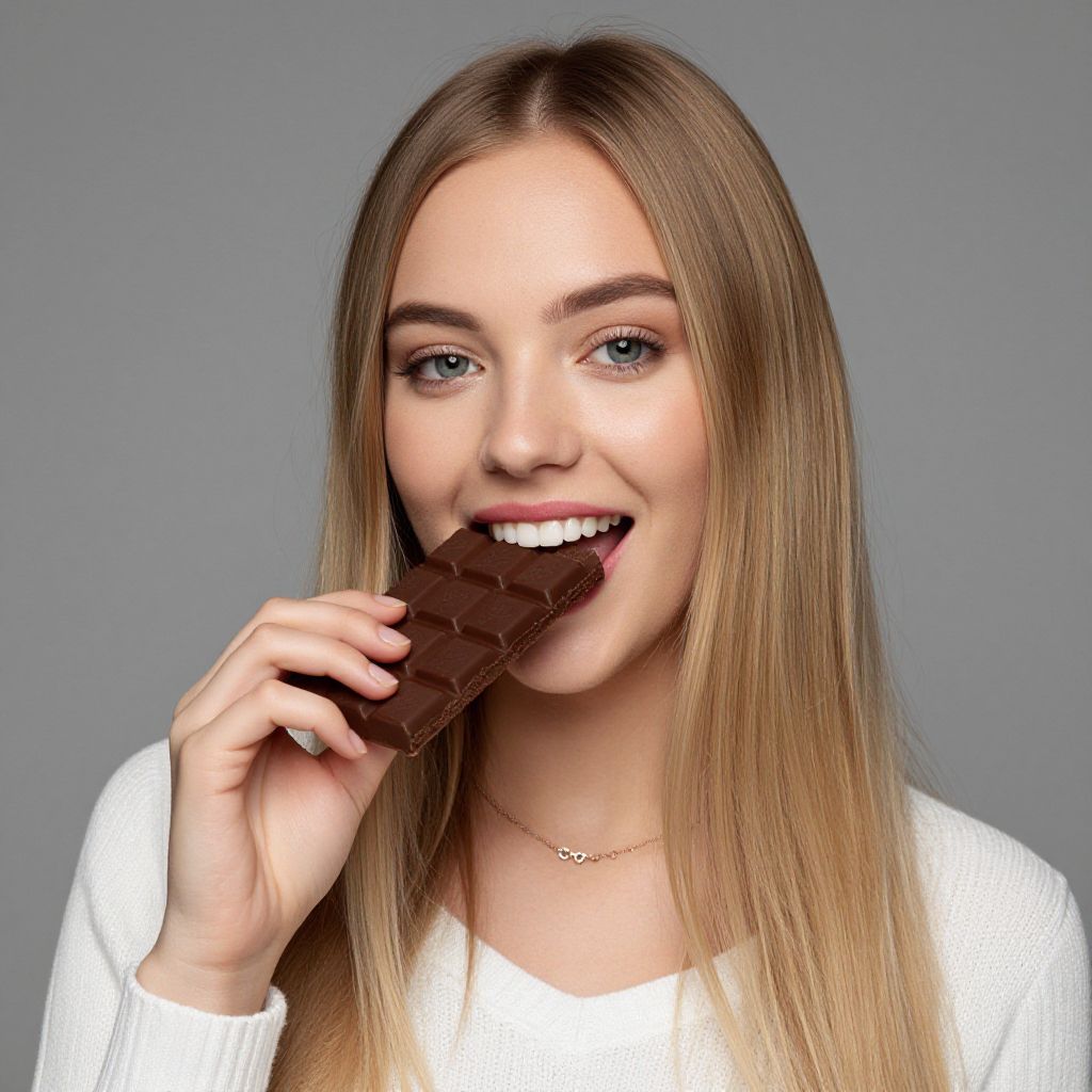 Cute young woman with long blonde hair and green eyes joyfully biting into a dark chocolate bar while wearing a white sweater and a delicate necklace, set against a neutral gray background.