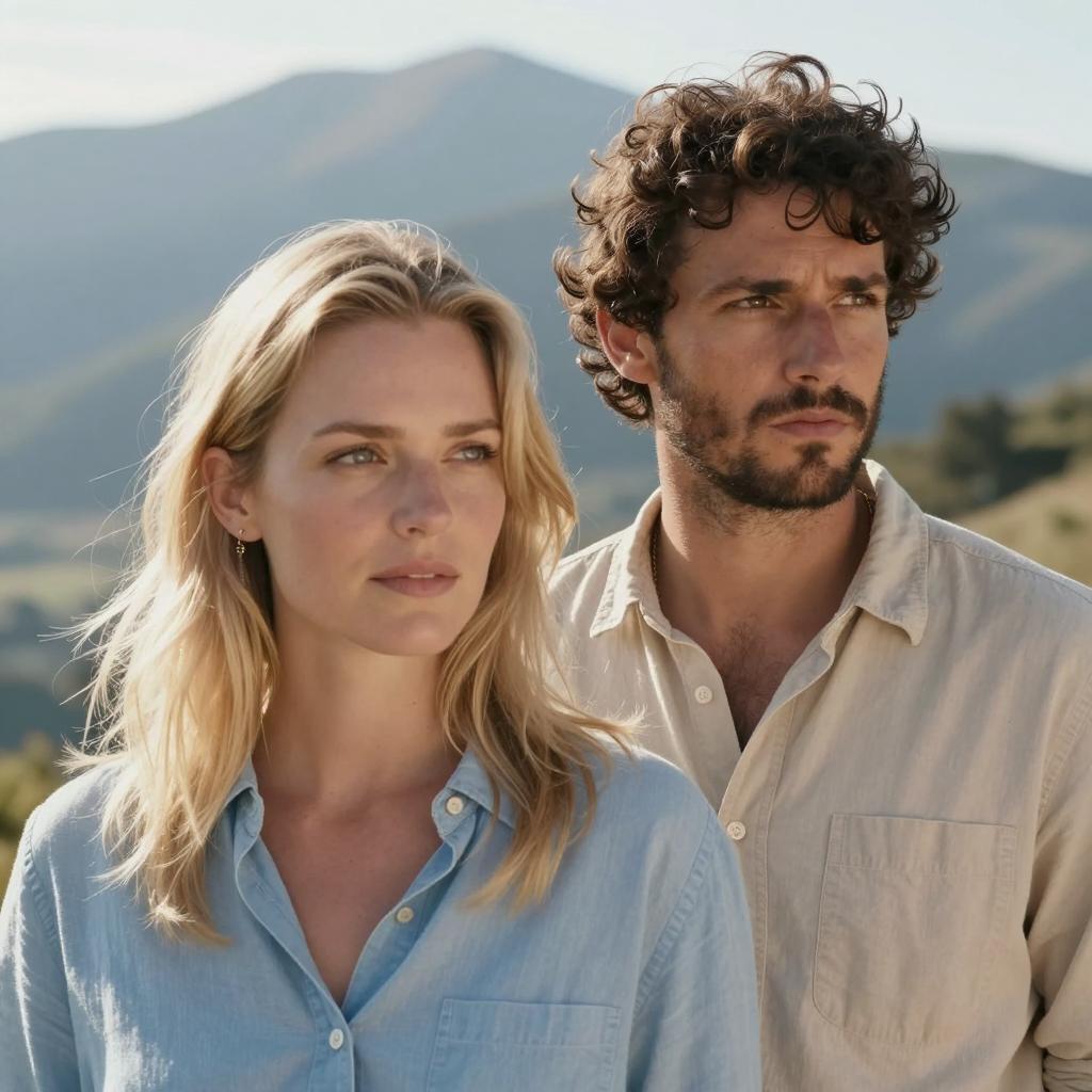 A close-up couple. Man with short dark hair, green collared shirt, slightly stubbled, serious expression. Woman with short blonde hair, light makeup, denim shirt, subtle smile. Heads close, eyes looking into camera, natural light. Background blurred.