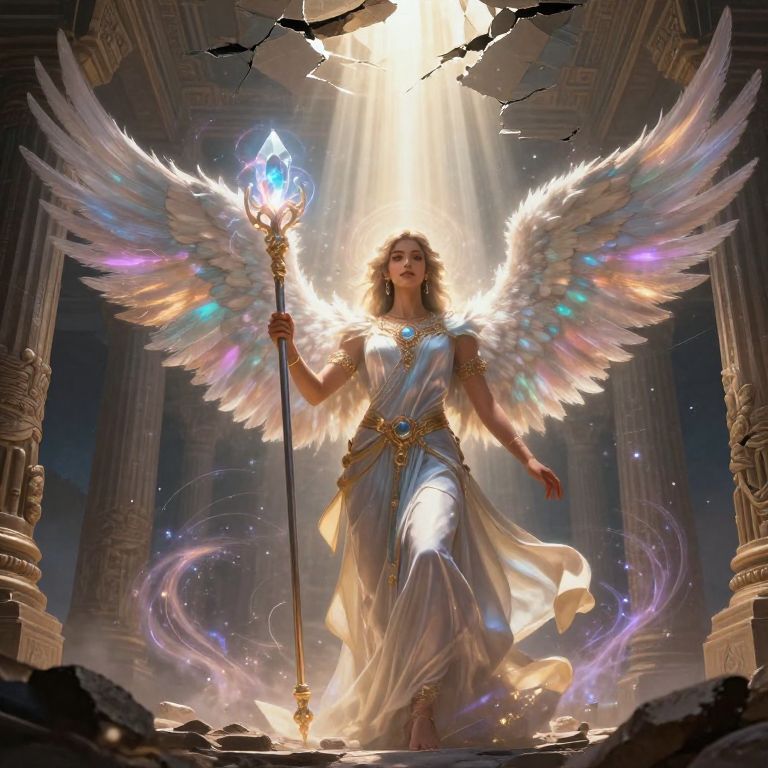 Digital artwork of an angelic woman with glowing white wings, holding a crystal-tipped staff, standing in a broken, radiant temple.