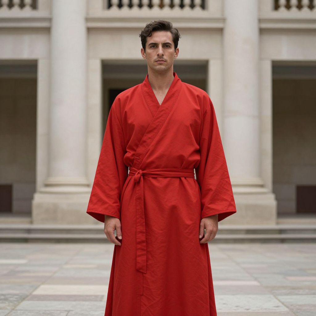 Photograph of a young man with short, dark hair and a serious expression, standing in front of a classical building with tall columns. He wears a vibrant red, satin-style kimono with a belt tied at the waist. The background features a stone-paved courtyard with a pattern of gray and white tiles. The building's facade has large, rectangular windows framed by the columns. The overall lighting is bright, highlighting the bold color of the kimono against the neutral tones of the architecture.