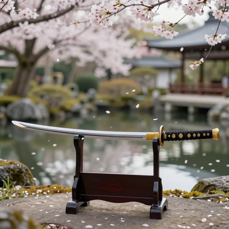 Afilada katana resting on a lacquered stand in a serene Japanese garden, delicate cherry blossoms falling, tranquil reflective pond in background, exquisite craftsmanship with golden undertones, soft morning light creating peaceful mood.