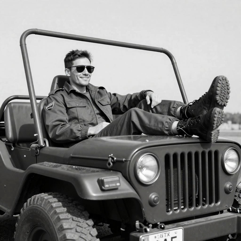 Black and white photograph of a man in a military-style jacket and sunglasses, reclining in an open-top military jeep. He leans back with legs propped up, hands on knees, and smiles slightly. Jeep has visible license plate and tires. Bright sky background.