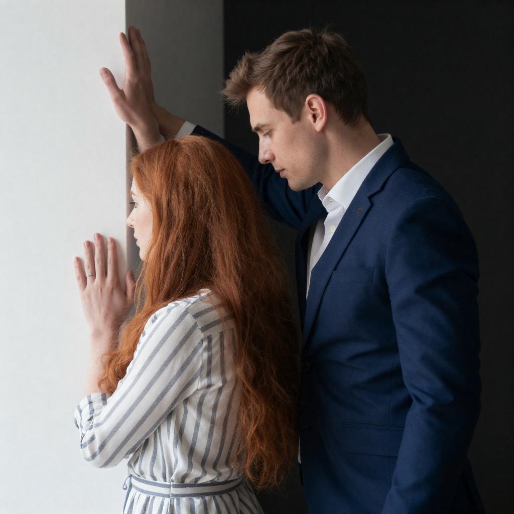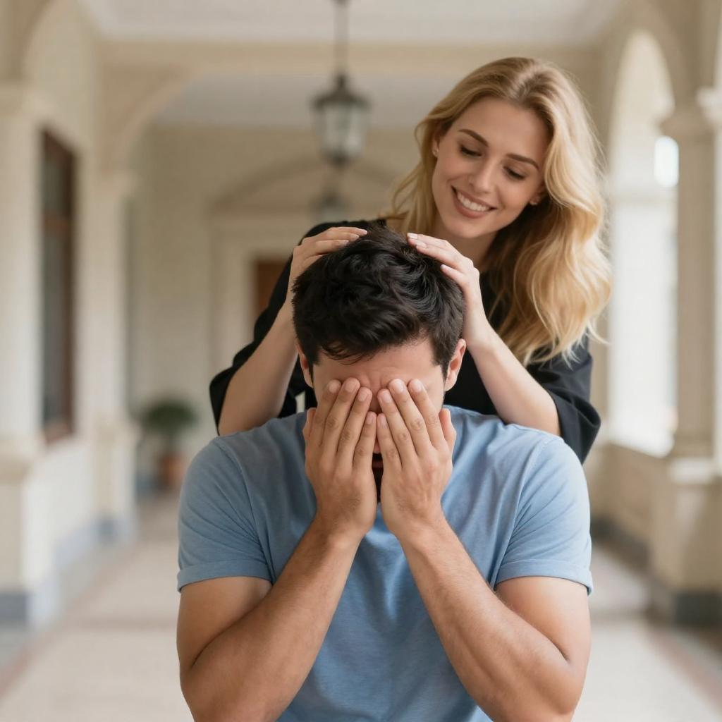 Photograph of a man and woman kneeling on grass, binding a man with a green striped shirt and brown pants. The woman, with long dark hair and a pink skirt, presses her hand on his chest, while the man, with short dark hair and a gray shirt, ties his hands. Background includes greenery and a brick wall.