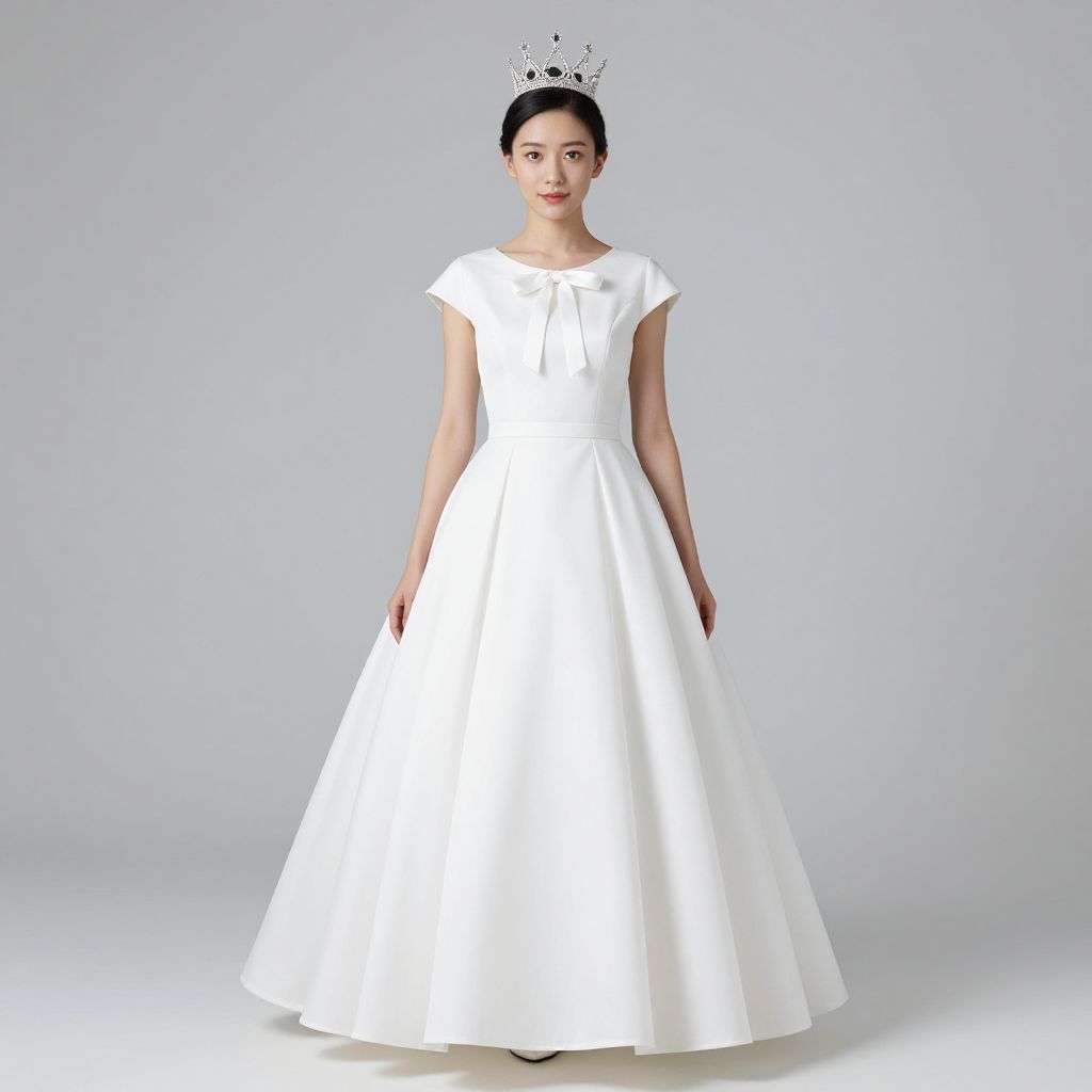 White Princess Frock, woman in a white dress with a tiable and a crown