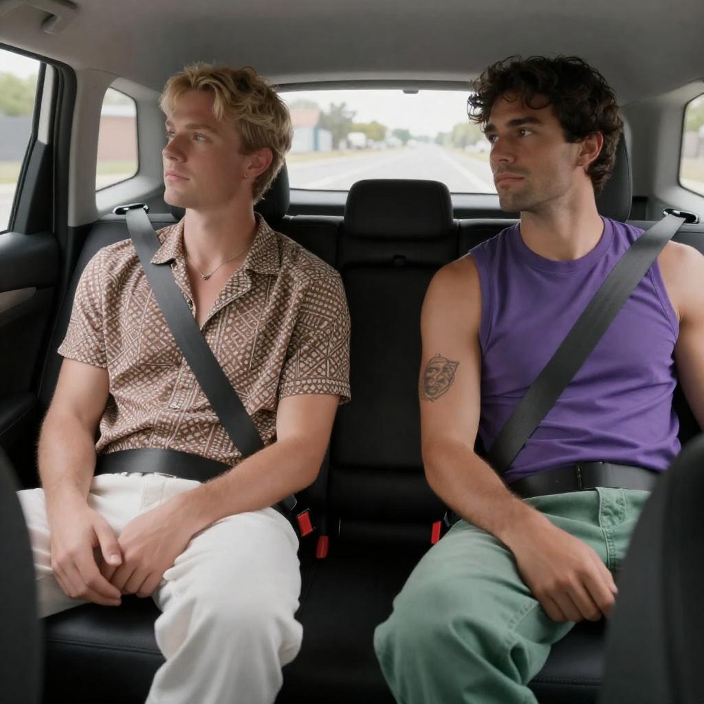 Photograph of two men seated at a wooden table. Left man with curly blonde hair, denim jacket, white shirt, necklace, pointing with index finger. Right man with straight brown hair, white headband, white polo shirt, neutral expression. Background: purple and green patterned curtain. Table has two clear glasses, metal container. Both men looking forward.