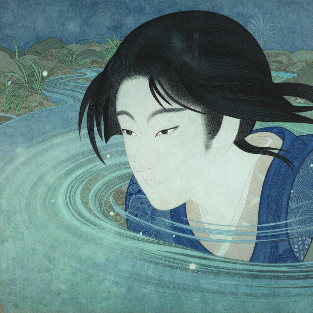 Ukiyo e oni emerging from a mystical river, ethereal blue and green hues, traditional Japanese art inspired composition, intricate linework and detailed facial expressions