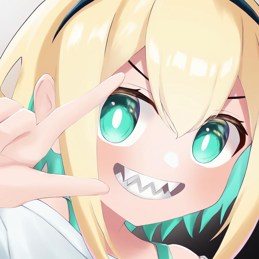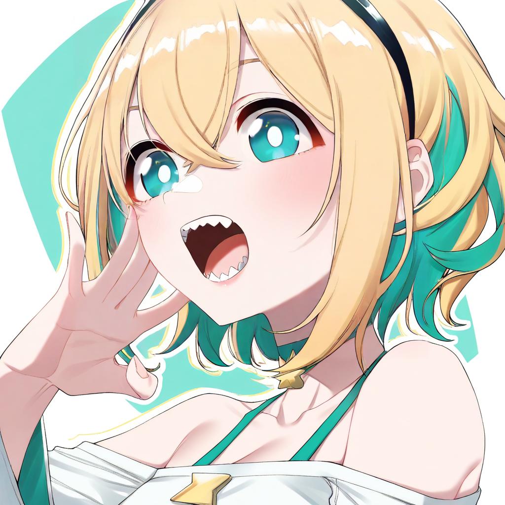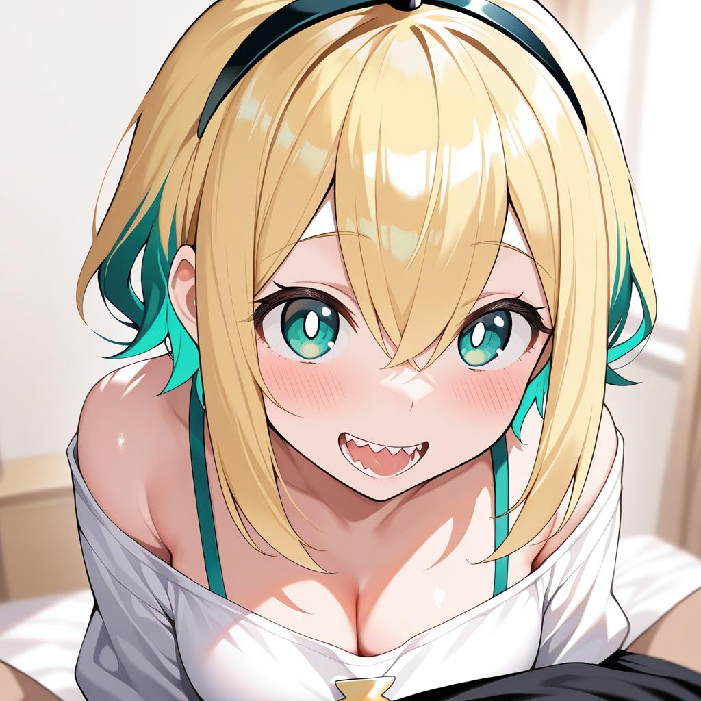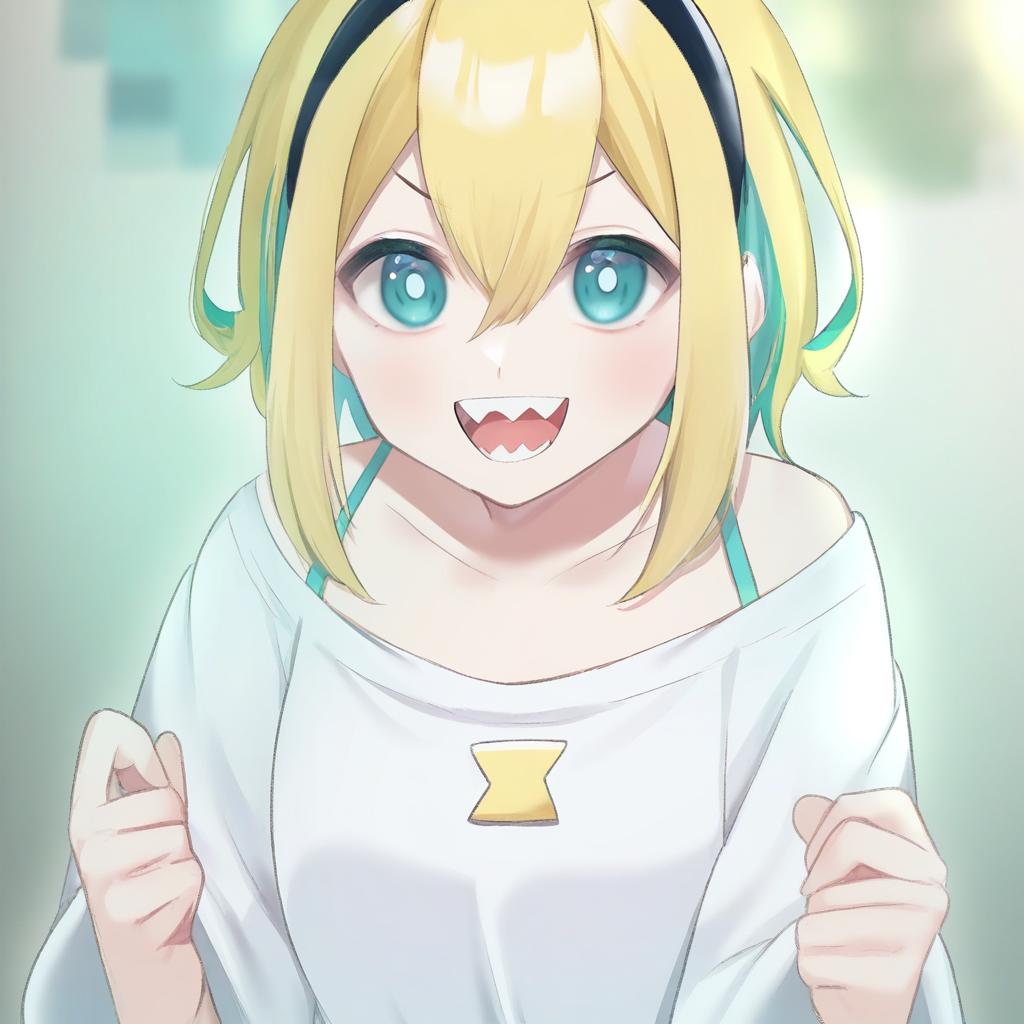 Amano pikamee, voms, 1girl, sharp teeth, green eyes, hair between eyes, white pupils, blonde hair, green hair, two-tone hair, short hair, colored inner hair, black hairband, white shirt, off-shoulder shirt, virtual youtuber, virtual youtuber, by artist thin (suzuneya), anime