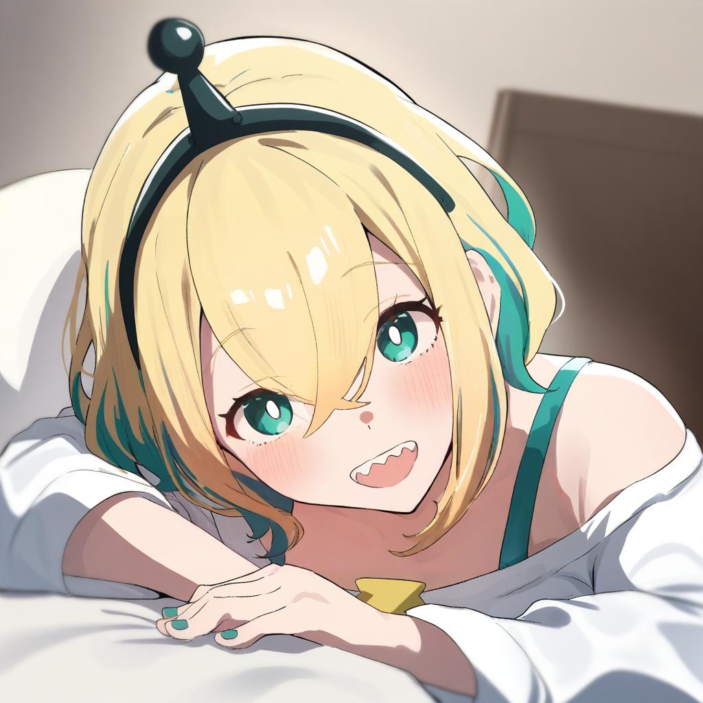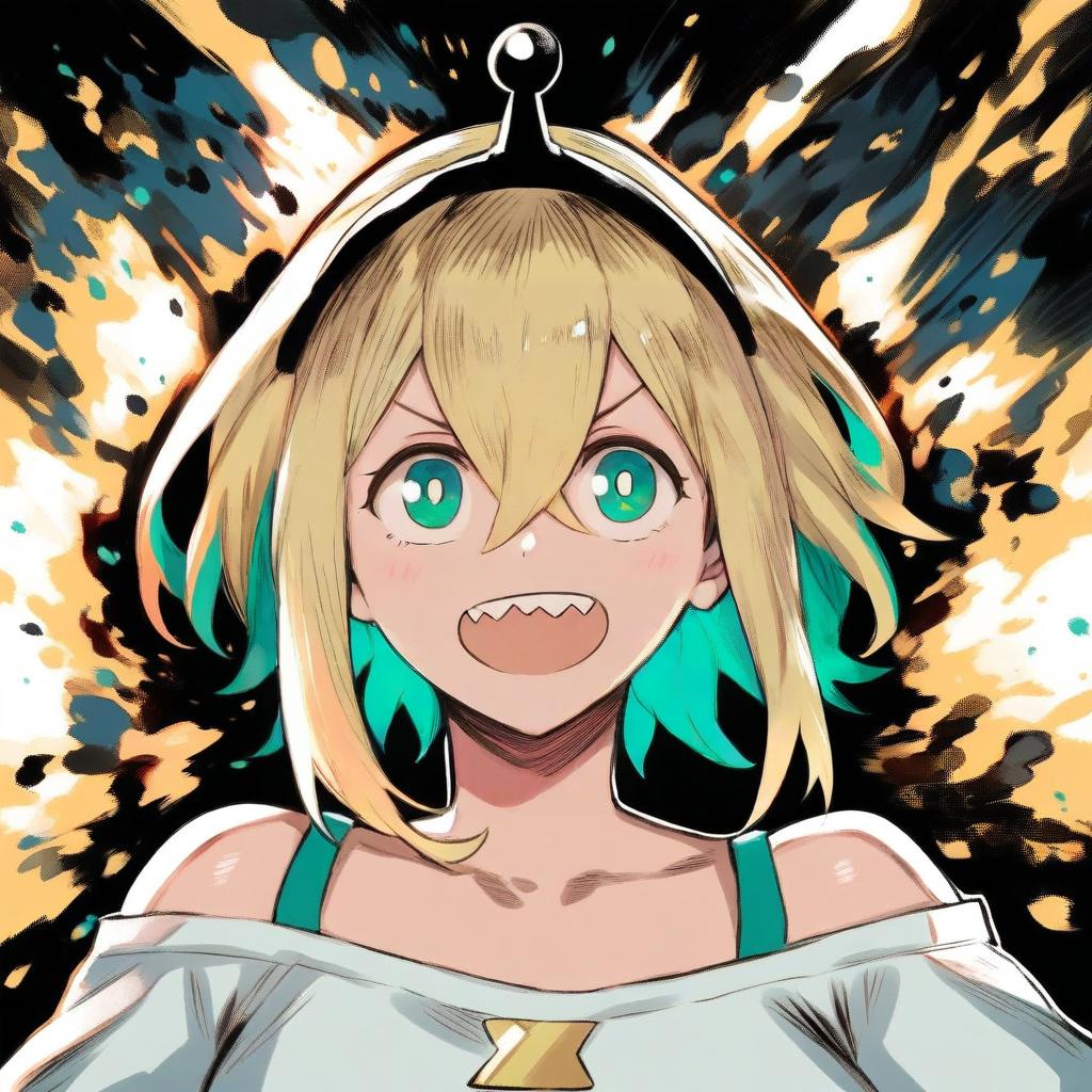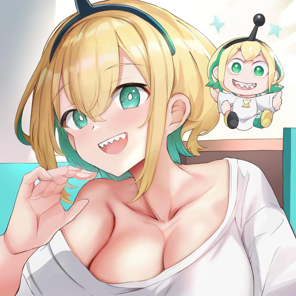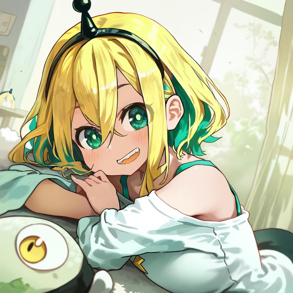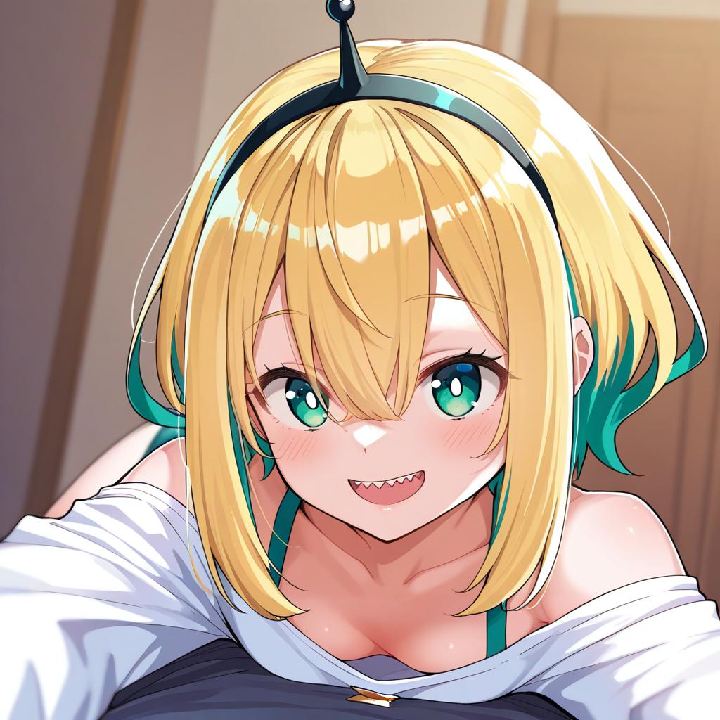 Amano pikamee, voms, 1girl, sharp teeth, green eyes, hair between eyes, white pupils, blonde hair, green hair, two-tone hair, short hair, colored inner hair, black hairband, white shirt, off-shoulder shirt, virtual youtuber, virtual youtuber, by artist thin (suzuneya), anime