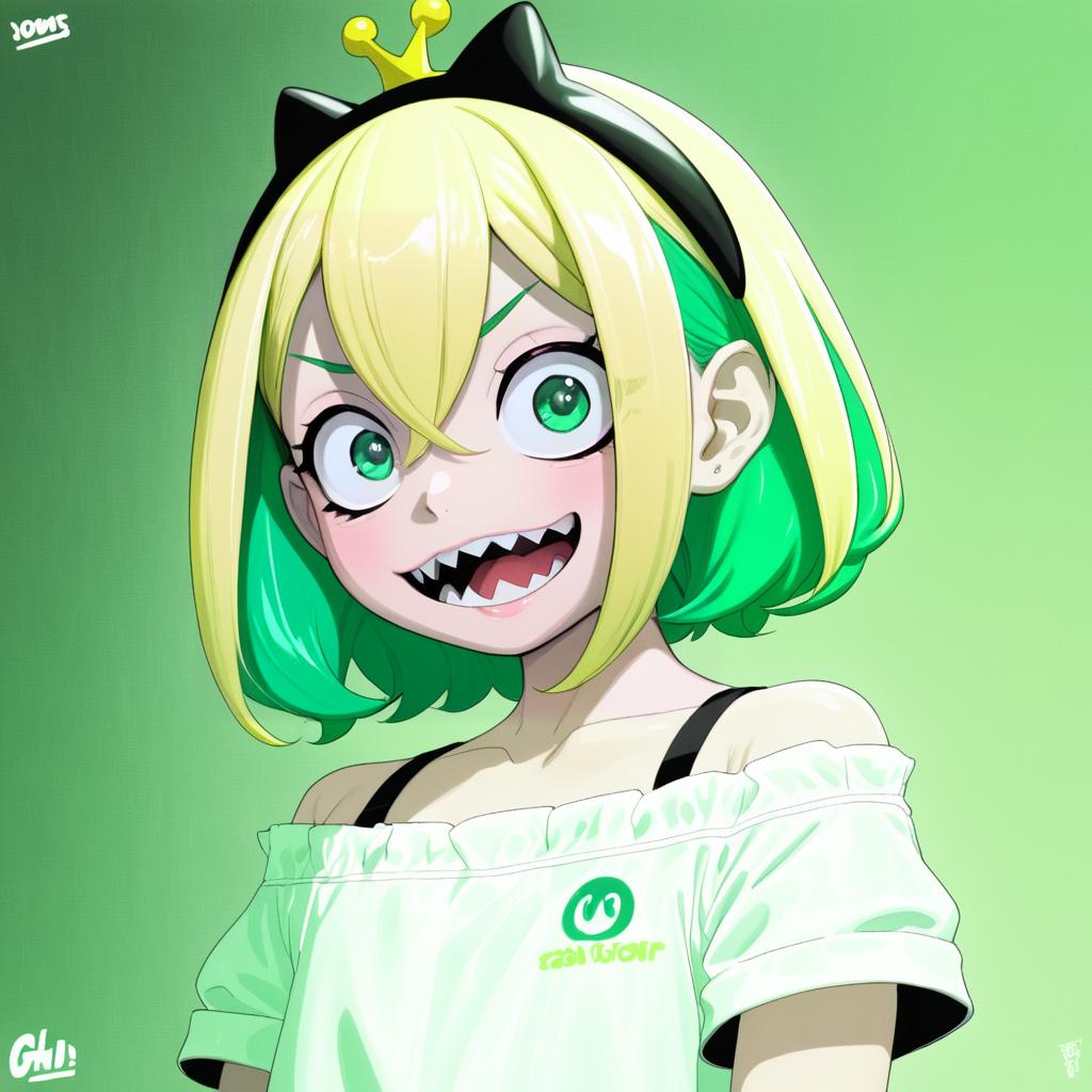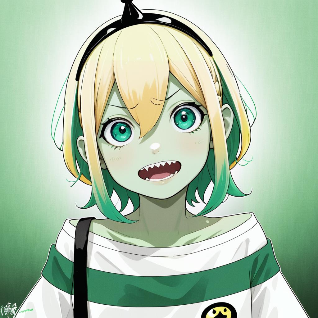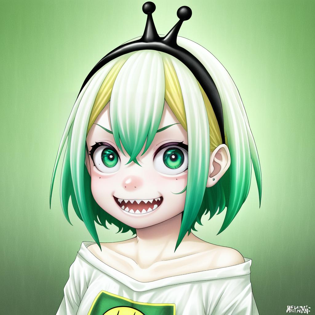 Digital anime-style portrait of a young girl with short two-tone green and blonde hair, bright green eyes with white pupils, and sharp teeth. She wears a black headband with round tips and a white off-shoulder shirt featuring a green and yellow graphic. The character has a playful, mischievous expression and is depicted against a soft green background.