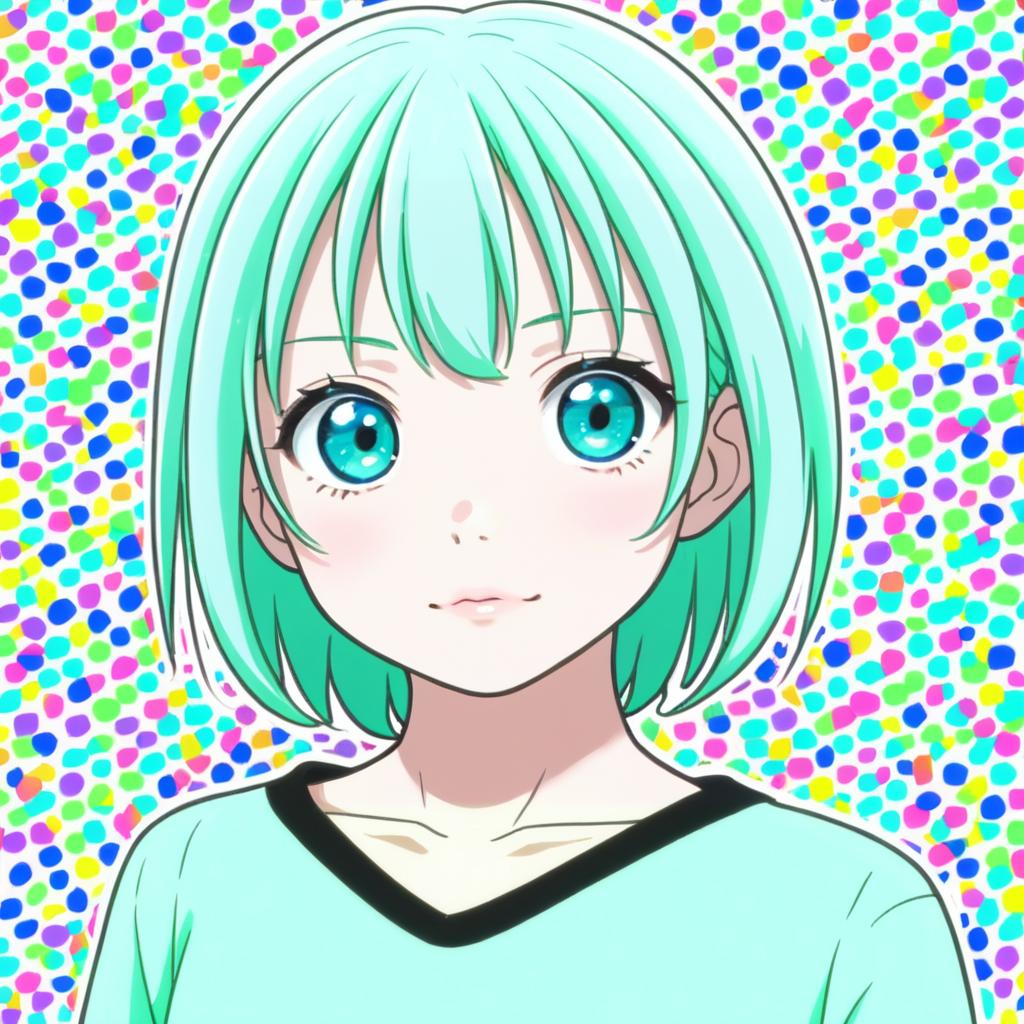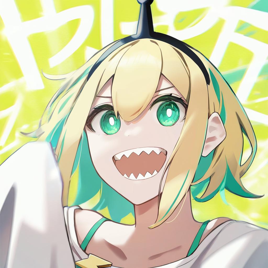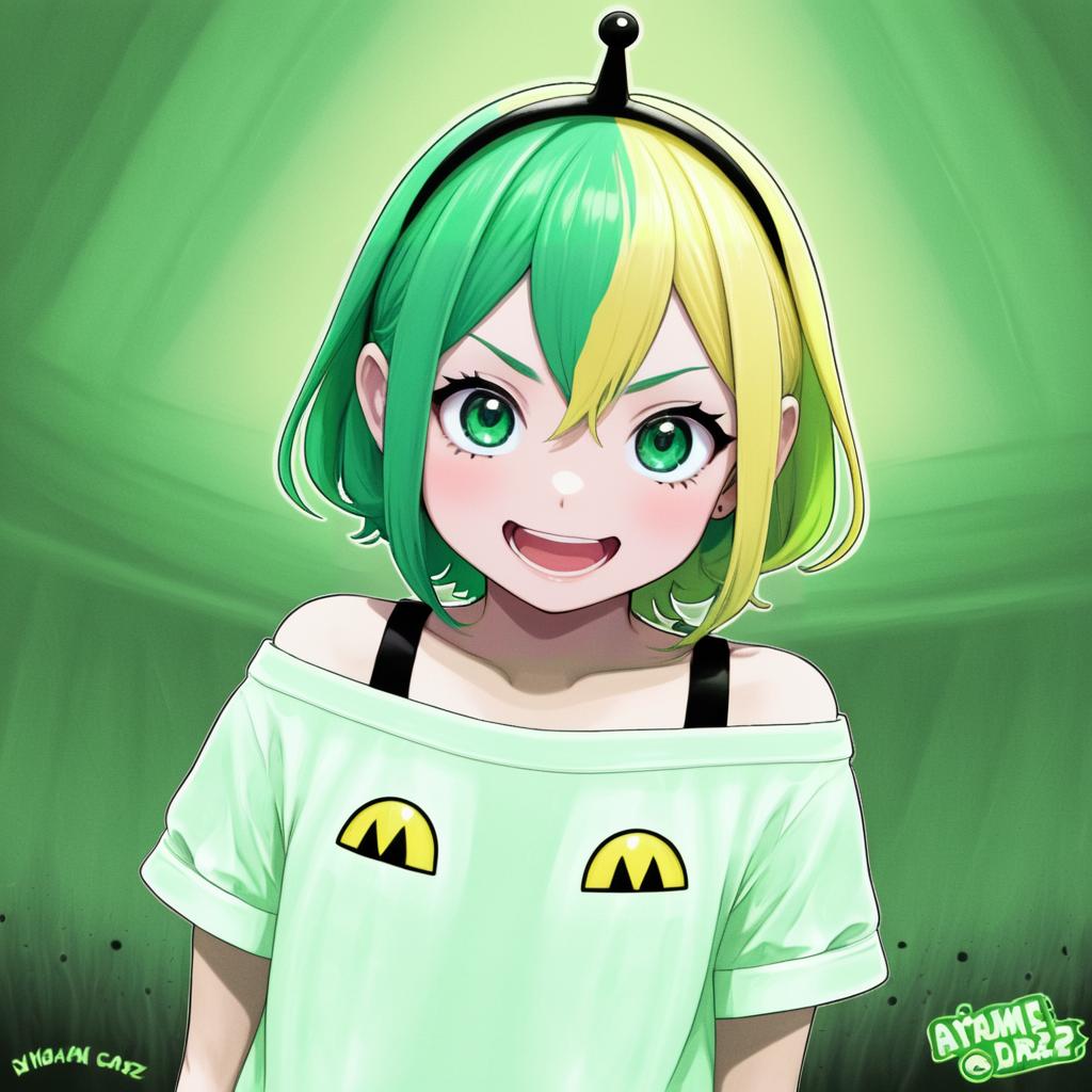 Digital anime-style portrait of a young girl with short two-tone green and blonde hair, bright green eyes with white pupils, and sharp teeth. She wears a black headband with round tips and a white off-shoulder shirt featuring a green and yellow graphic. The character has a playful, mischievous expression and is depicted against a soft green background.
