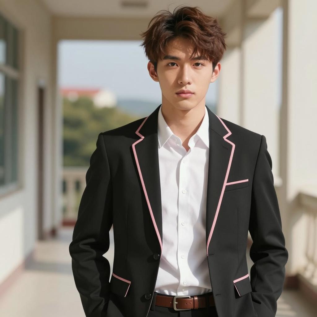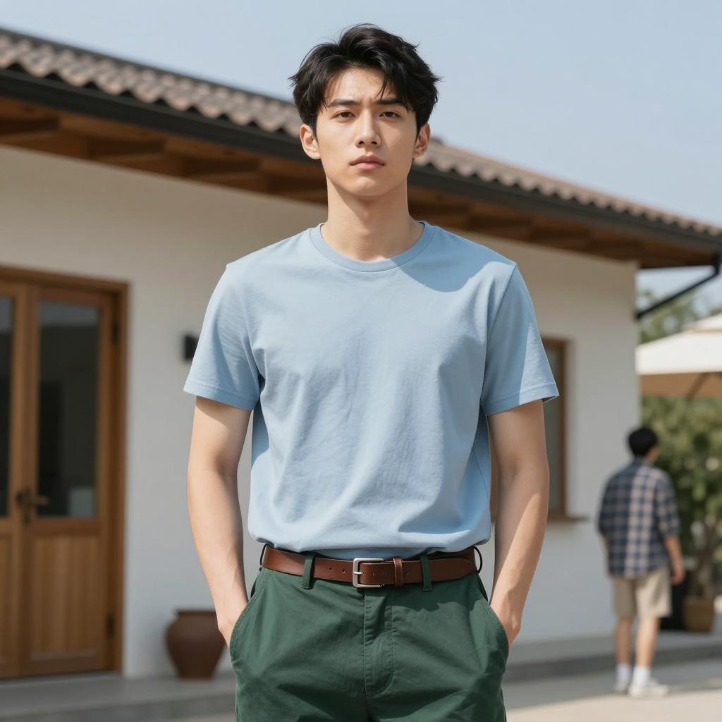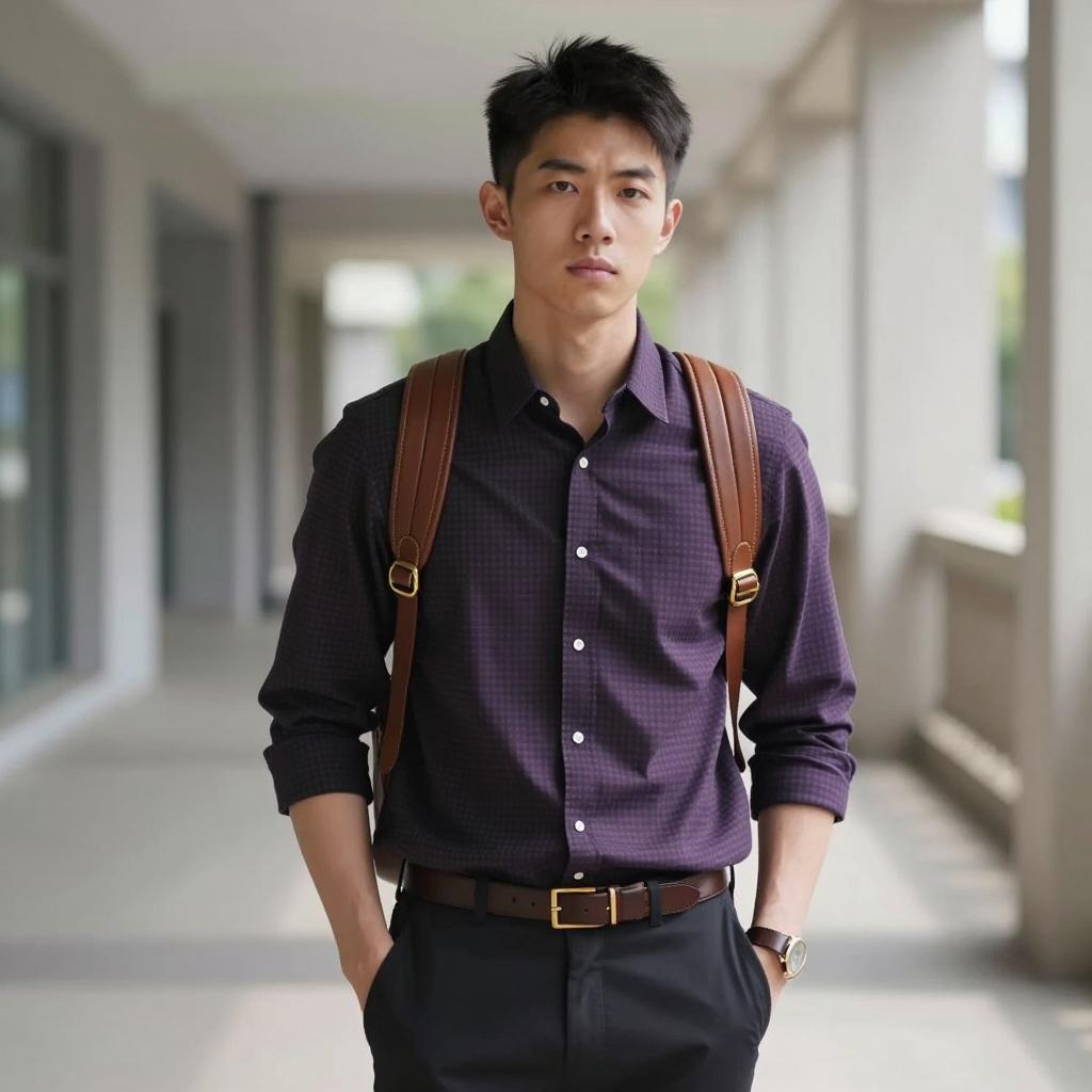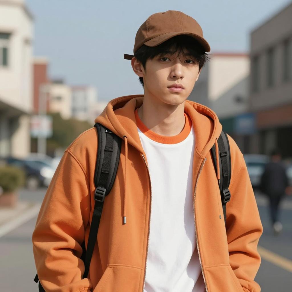 Photograph of a young man with light skin and short dark brown hair standing outdoors in sunlight. He is dressed in a casual brown cardigan with a dark brown collar over a white t-shirt, paired with loose orange pants. He holds a black leather handbag in his right hand. The background features a yellow building, green trees, and a red trash can, with a slightly blurred modern urban setting.