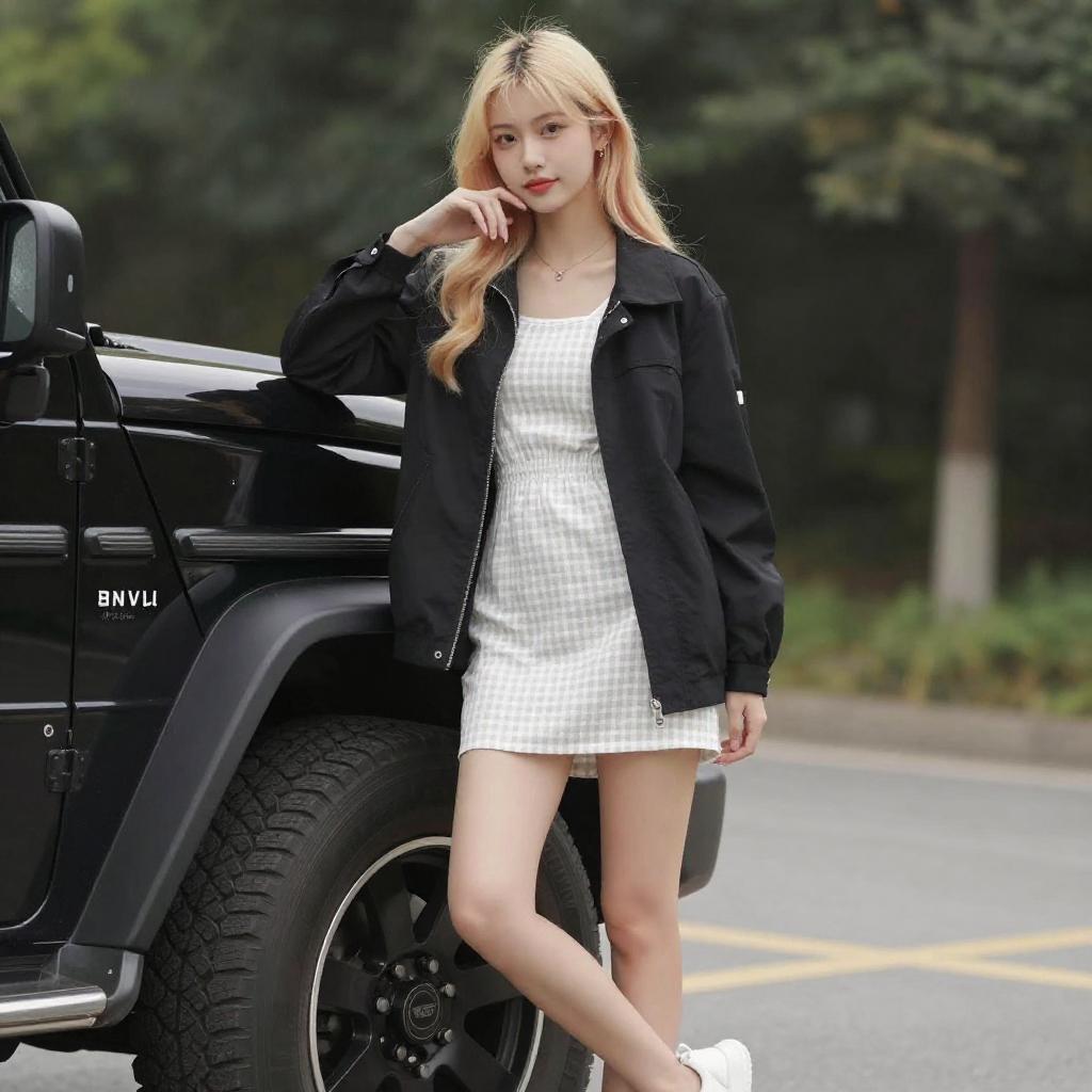 Photograph of a young woman with light blonde hair, wearing a black jacket over a white, short, checkered dress, and white sneakers. She stands beside a black vehicle with shiny tires, leaning slightly with her right hand touching her chin, looking at the camera with a subtle smile. The background is blurred greenery.