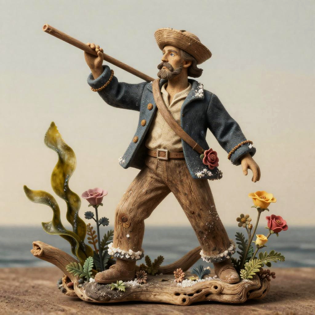 A sea captain sculpted from driftwood, kelp, and sea roses intricately designed and salt-crusted, composed of various flowers and foliage. This artwork channels the styles of renowned artists, presented in a hand-tinted platinum print from the early 20th century maritime portrait.