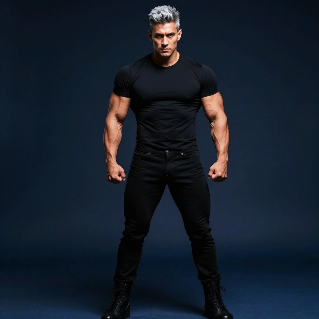 Photograph of a muscular, tan-skinned man with blue spiky hair standing in shallow ocean waves. He wears black camouflage pants with suspenders and a black choker. His well-defined, glistening muscles are prominent, and he has a serious expression. The background shows a clear sky and gentle ocean waves. The image is brightly lit, highlighting his wet skin and the texture of the water. His physique is highly muscular with a broad chest and large biceps. The overall style is bold and dramatic, emphasizing his physical strength and presence.