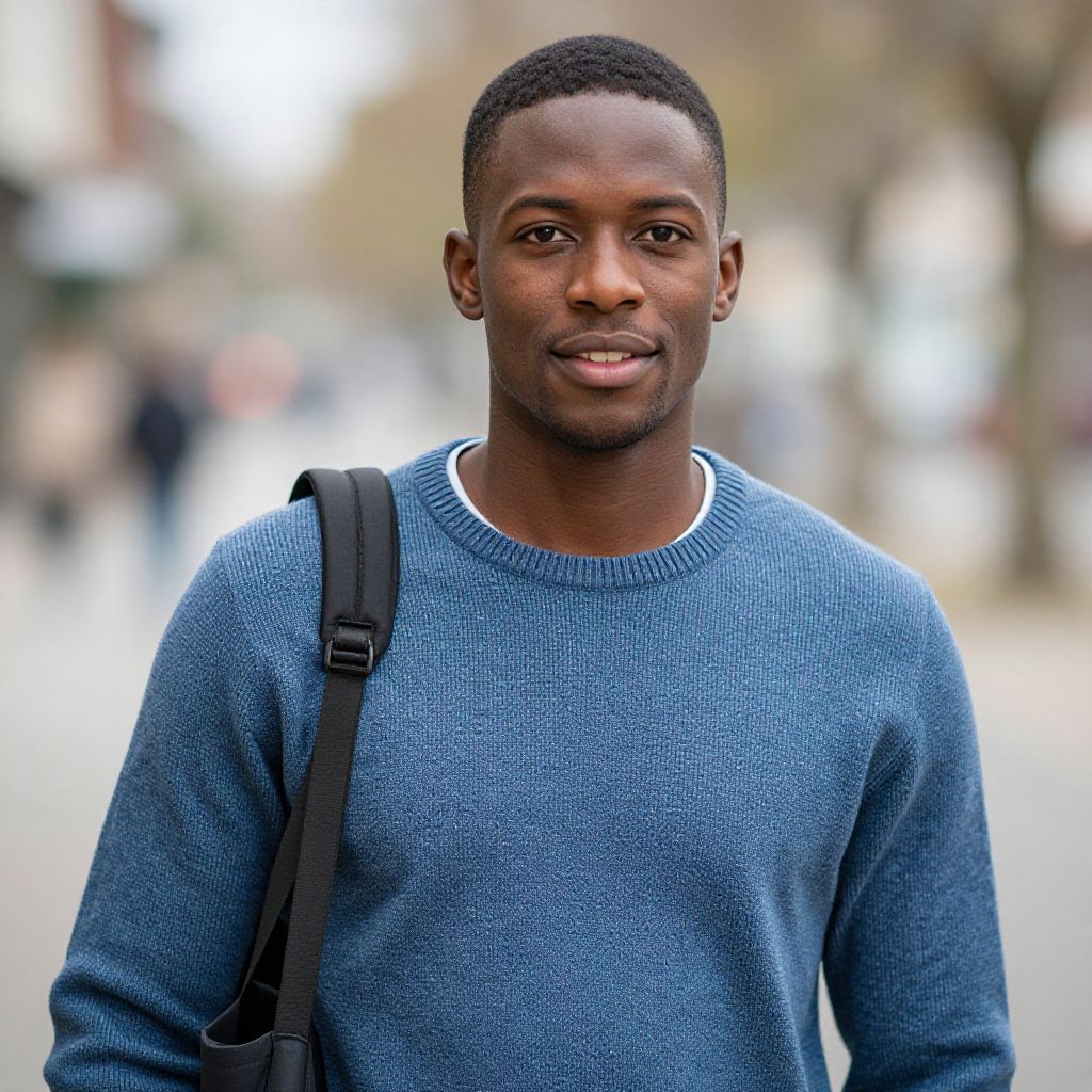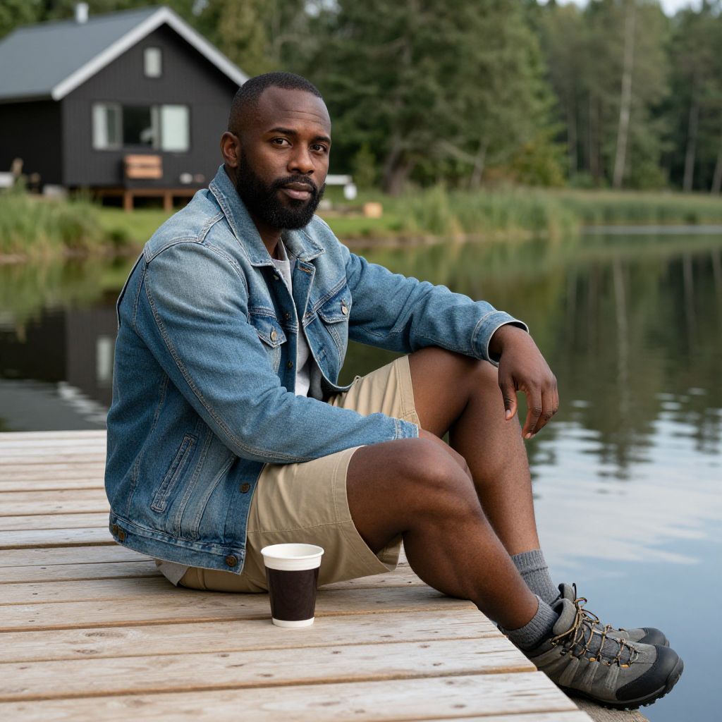 A relaxed outdoor look at a rural lakeside cabin, showing a man with deep brown skin, short beard, and brown eyes, dressed in a relaxed denim jacket, khaki shorts, and hiking socks, sitting on a wooden dock with a cup of coffee, water reflections visible in the calm lake