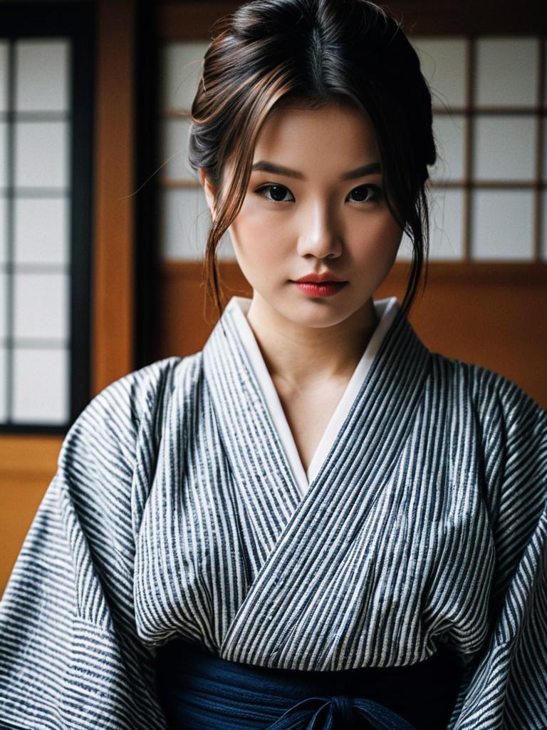 Woman jinbei clothing, 1girl, solo, japanese clothes, looking at viewer, kimono, blurry, realistic, blurry background, brown hair, upper body, lips