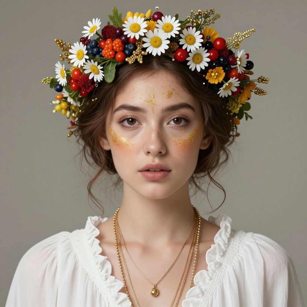 Ethereal beauty emerges as a woman adorned with a vibrant floral crown, featuring daisies, berries, and golden beads, complemented by delicate gold dust scattered across her cheeks and forehead, while wearing a white ruffled blouse and layered necklaces.