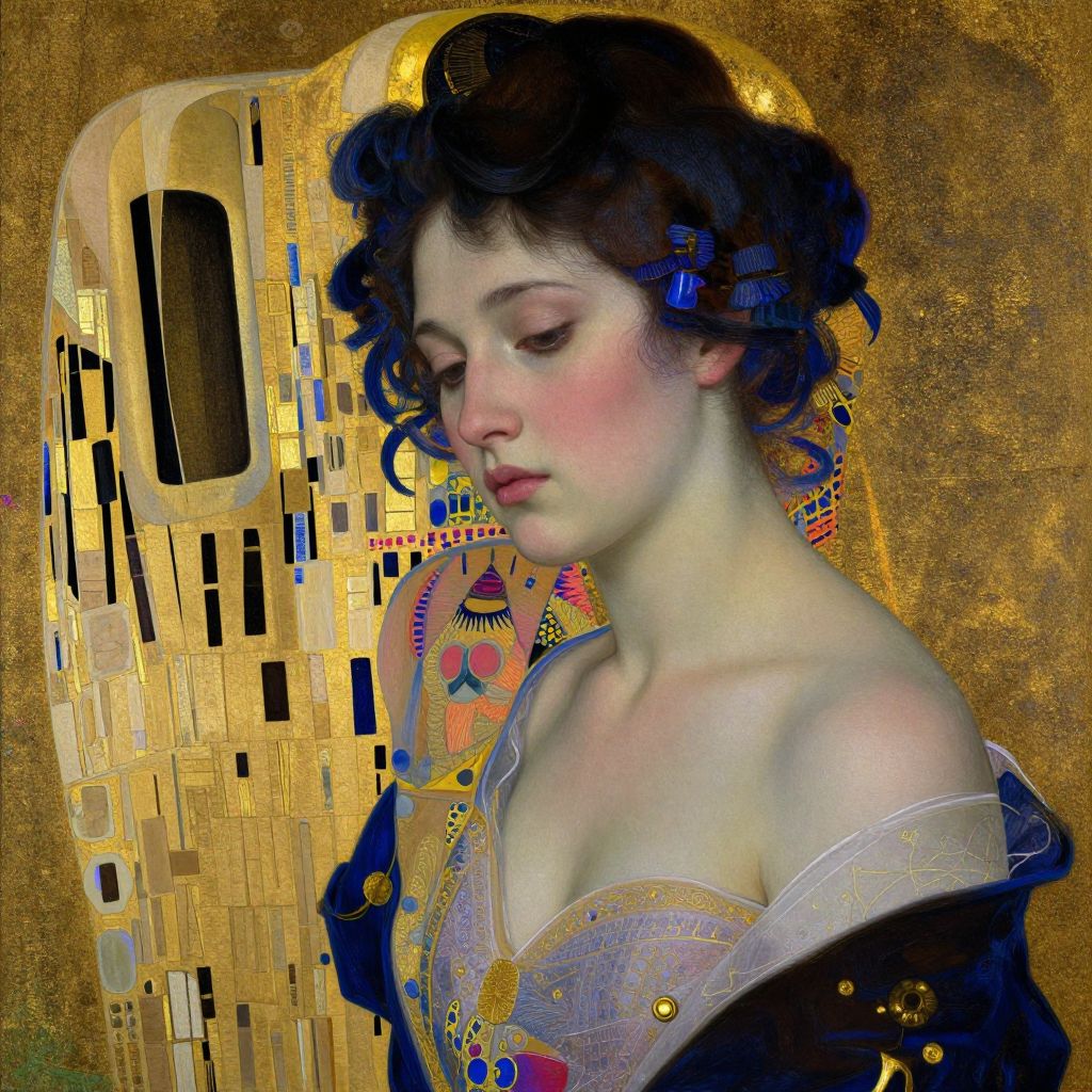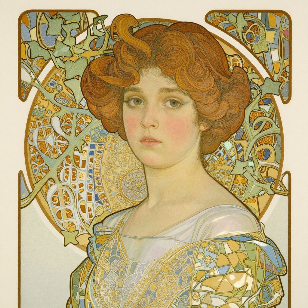 Digital art portrait of a fair-skinned, red-haired woman with a butterfly hairpin, surrounded by intricate, floral Art Nouveau patterns.
