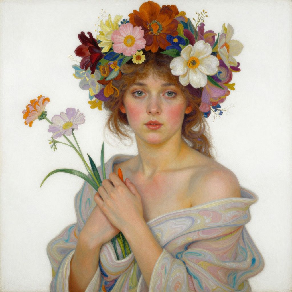 This is a digital painting in an Art Nouveau style, featuring a young woman with fair skin and large, expressive green eyes. She has short, wavy auburn hair adorned with a small white flower on the right side. Her lips are slightly parted, and she has a soft, innocent expression. She wears an off-the-shoulder white garment that reveals her collarbones. The background is an intricate, circular pattern with orange, white, and gray floral motifs. The overall color palette is warm, with rich oranges and soft whites, creating a harmonious and elegant composition.