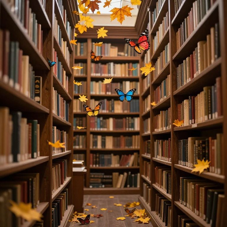 An enchanted library where autumn leaves and vibrant butterflies dance among ancient shelves, blurring the line between nature and knowledge.