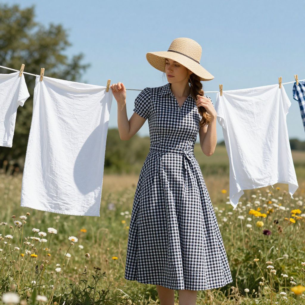 Tradewife hanging freshly washed linens on a clothesline in a sunny yard, wearing a classic gingham dress and wide-brimmed straw hat, gentle breeze moving the fabric, quaint rural setting with wildflowers and blue sky, evoking simplicity and elegance.