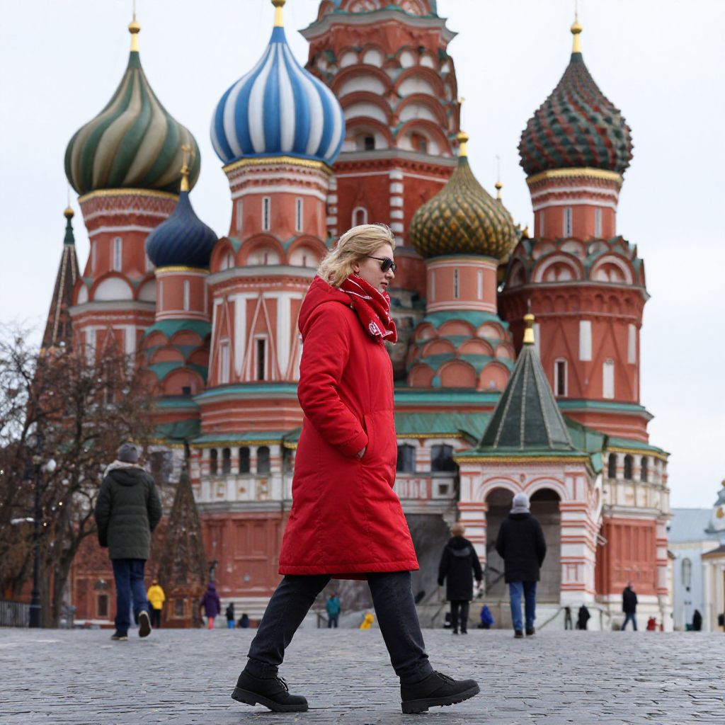 Photograph of a person in a bright red coat, black pants, and black boots walking in front of the colorful, onion-domed spires of St. Basil's Cathedral in Moscow. The person has blonde hair and is wearing sunglasses. The cathedral's domes are vividly colored in blue, green, yellow, and red, with intricate white and green detailing. Several people in winter attire are in the background, and bare trees flank the scene. The ground is cobblestone, and the sky is overcast. The overall atmosphere is vibrant yet chilly.