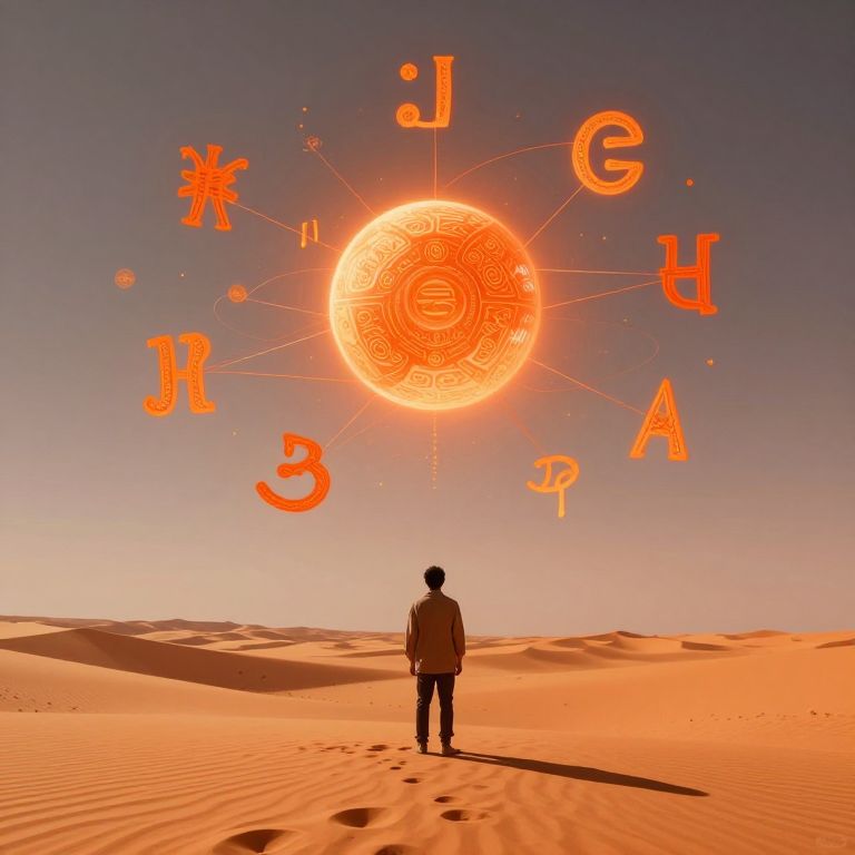 Linguist stands in a vast, orange desert, gazing upward as vibrant orange glyphs float and orbit around a central, luminous sphere, each symbol connected by delicate lines and adorned with intricate patterns representing phonetic meanings.