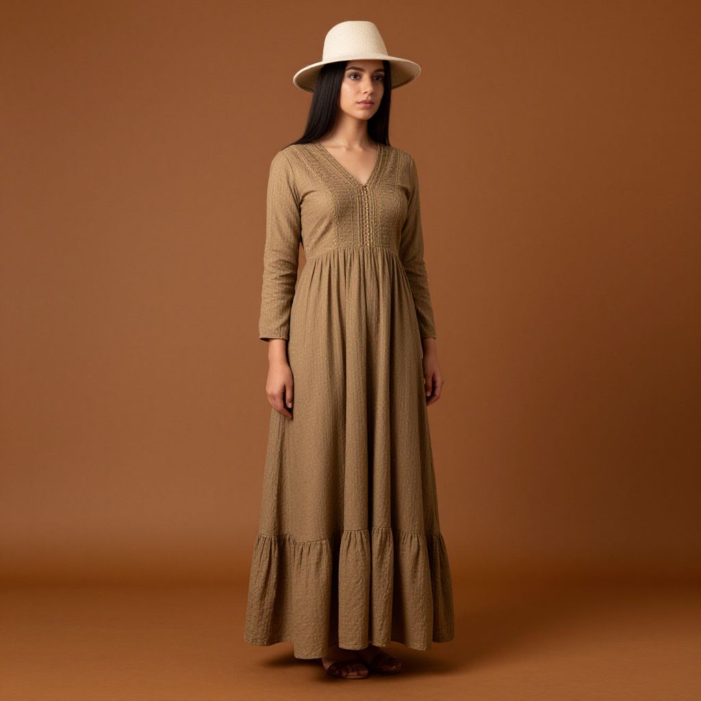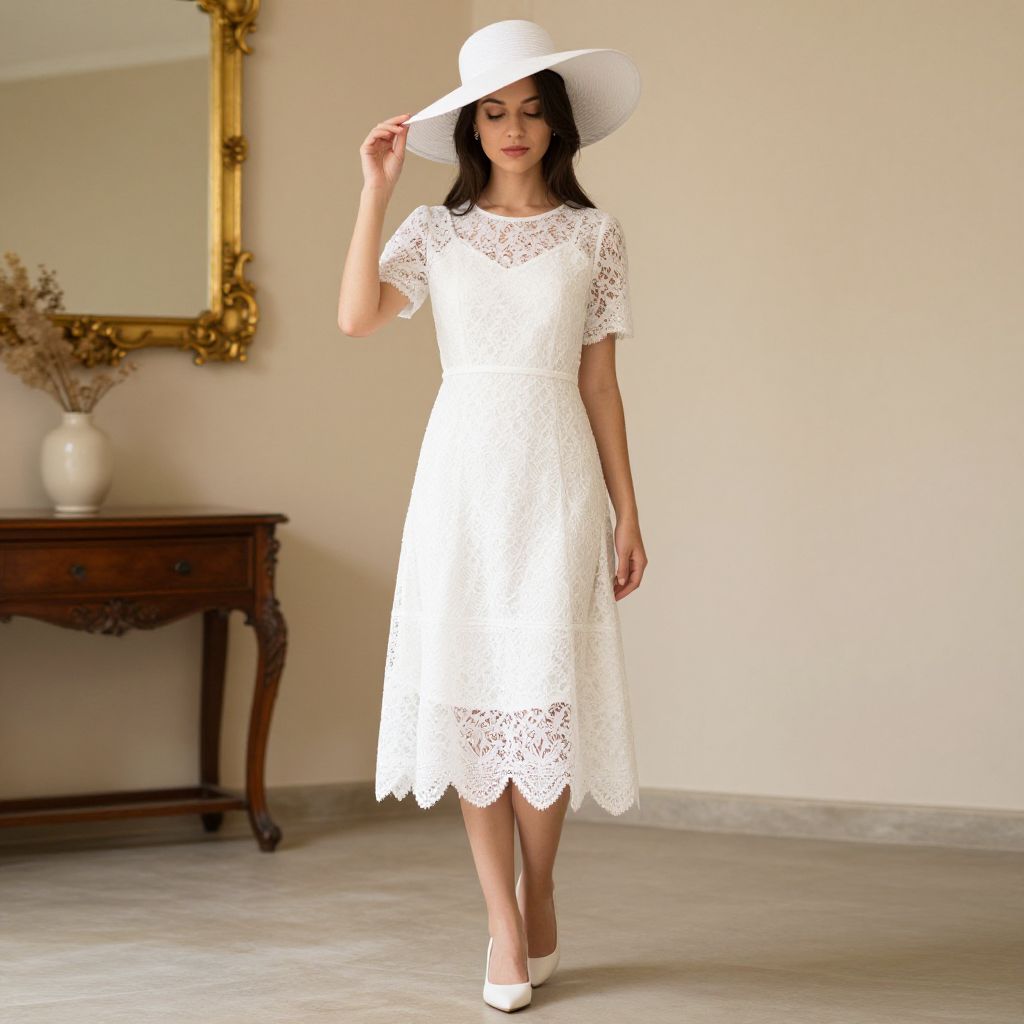 "Western Tunic Dress, woman in a white dress and hat standing in front of a wall"