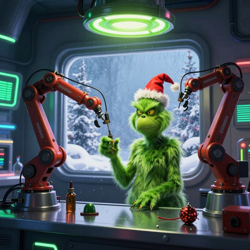 Digital artwork of a fuzzy green, anthropomorphic creature with yellow eyes, wearing a Santa hat, standing at a futuristic lab table. The creature holds a small, glowing object with one hand. Two red robotic arms with green lights are positioned on either side of the creature, each holding another object. The background features a large window showing a snowy, forested landscape. The lab is illuminated by a green overhead light. On the table are a small bottle and a red, spherical ornament. The scene combines sci-fi and festive elements with vibrant, contrasting colors.