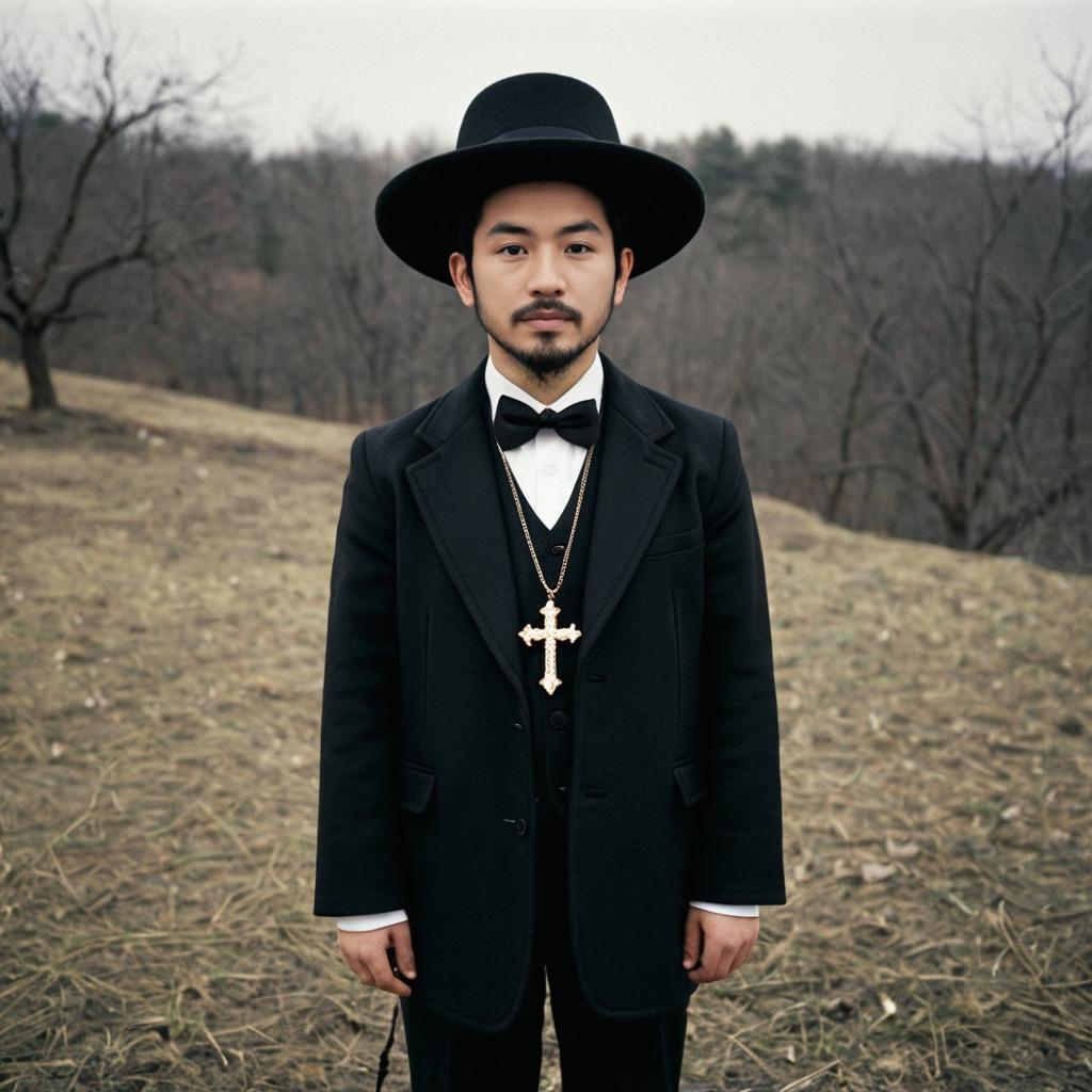Portrait of an Asian man dressed in an orthodox style black outfit featuring a wide-brimmed hat, black coat, black bowtie, white shirt, and pants. He wears a large gold Latin cross necklace and has neatly groomed facial hair including a beard and mustache. The man stands outdoors on a dry, grassy field with barren trees in the background, looking directly at the viewer with a neutral expression.