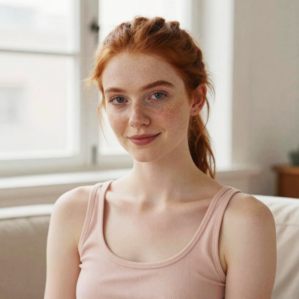 Photograph of a beautiful red-haired woman with fair skin, lying in a red hammock. She has long, wavy hair cascading over her shoulders and is wearing a white, sleeveless top with thin straps. Her eyes are closed, and she's basking in sunlight, creating a soft glow on her face. The background is blurred greenery, adding a peaceful, outdoor vibe. The sunlight highlights her serene expression and relaxed posture.