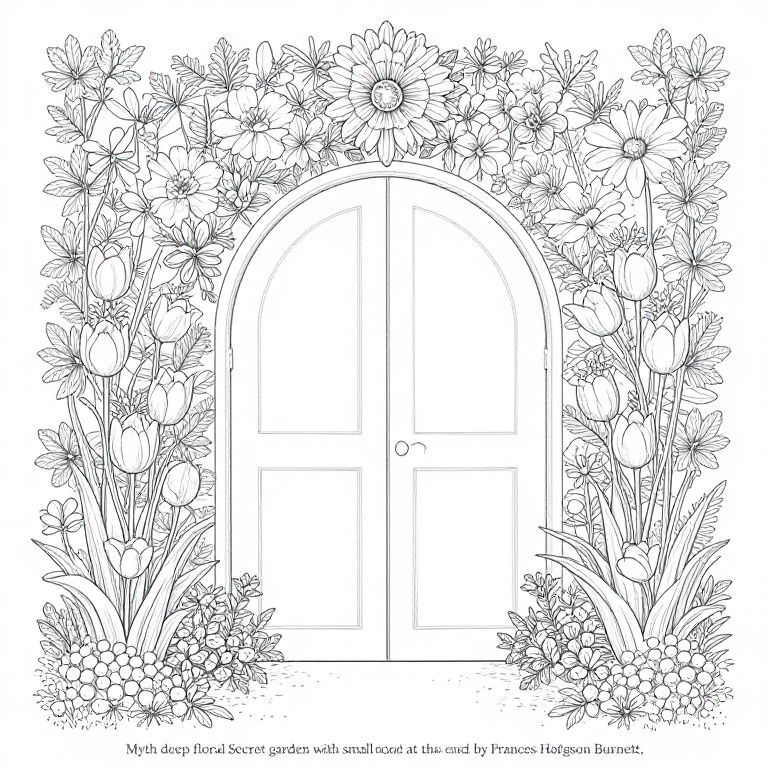 "Myth deep floral Secret garden with small round door at the end coloring page by Frances Hodgson Burnett,"